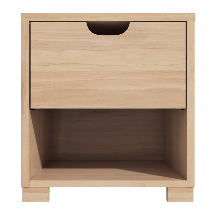 This neat and compact design fits perfectly by the bedside, holding necessities at an ideal height upon the spacious surface top. Housing a single drawer and open storage space you get the best of both, concealed storage as well as easy access storage.