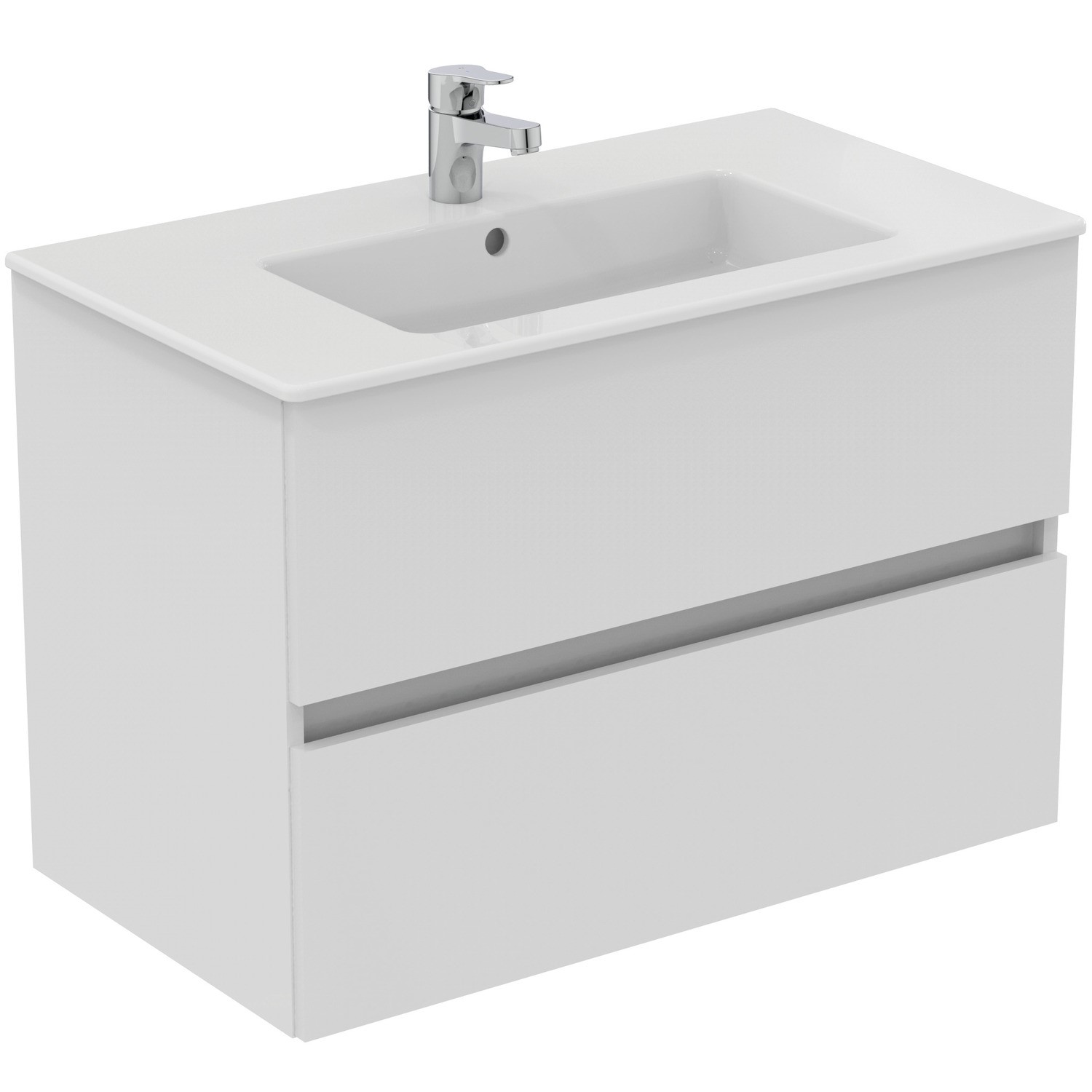 Enhance your bathroom with the modern Eurovit+ 800mm wall hung vanity unit from Ideal Standard, finished in a fresh white gloss. This vanity unit provides essential storage within two soft close drawers make it easy to store your toiletries and cleaning products, and the white gloss finish instantly brightens your room and is easy to wipe down and maintain. The wall mounted installation opens up your floor space, giving the illusion of more space and making floor cleaning a breeze. The unit also features a minimalist handle-free design giving a sleek, modern look with concealed handles for clean lines and a clutter-free finish. Crafted from PEFC-certified wood, the Eurovit+ collection aligns with Ideal Standard’s commitment to sustainability and eco-friendly product development, meaning the vanity unit is crafted with wood from forests managed sustainably, balancing environmental, social, and economic needs.
