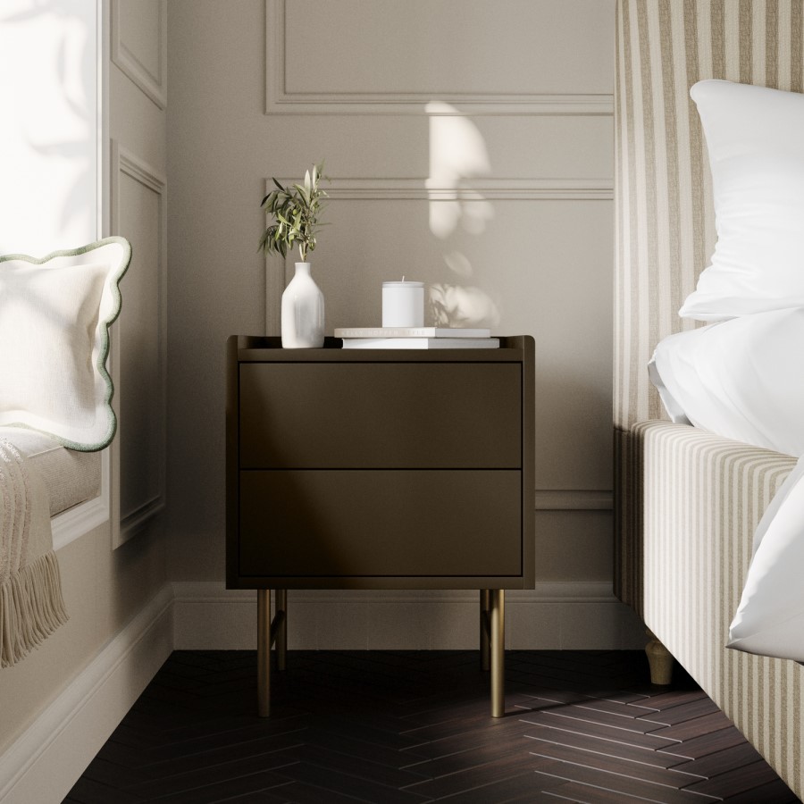 The Zane Bedside Table combines sleek, contemporary design with practical functionality. Its minimalist, handle-free form features two spacious push-to-open drawers on smooth metal runners, perfect for storing bedside essentials and keeping your bedroom organised. A subtle border around the top keeps surface items secure, while the warm khaki green matt finish and contrasting brushed-gold legs add a touch of understated luxury. Elevated for easy cleaning underneath and crafted from durable materials, the Zane bedside table is a stylish, modern, and long-lasting addition to any bedroom.