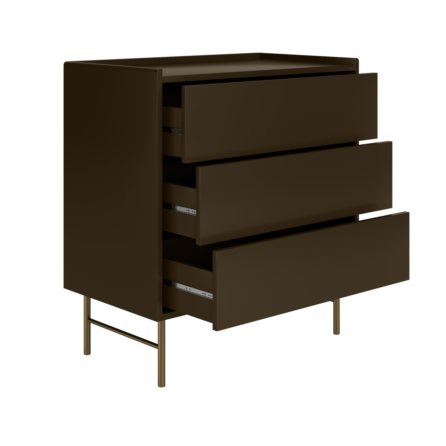 The Zane Chest of 3 Drawers combines sleek, contemporary design with practical functionality, making it a refined bedroom dresser. Its minimalist, handle-free form features six spacious push-to-open drawers on smooth metal runners, perfect for storing clothes, bedding, and everyday essentials. A subtle border around the top keeps surface items secure, while the warm khaki green matt finish and contrasting brushed-gold legs add a touch of understated luxury. Elevated for easy cleaning underneath and crafted from durable materials, the Zane chest of 3 drawers is a stylish, modern, and long-lasting addition to any bedroom.
