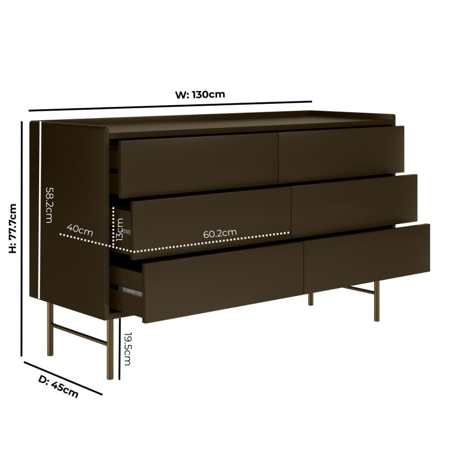 The Zane Chest of 6 Drawers combines sleek, contemporary design with practical functionality, making it a refined bedroom dresser. Its minimalist, handle-free form features six spacious push-to-open drawers on smooth metal runners, perfect for storing clothes, bedding, and everyday essentials. A subtle border around the top keeps surface items secure, while the warm khaki green matt finish and contrasting brushed-gold legs add a touch of understated luxury. Elevated for easy cleaning underneath and crafted from durable materials, the Zane chest of 6 drawers is a stylish, modern, and long-lasting addition to any bedroom.
