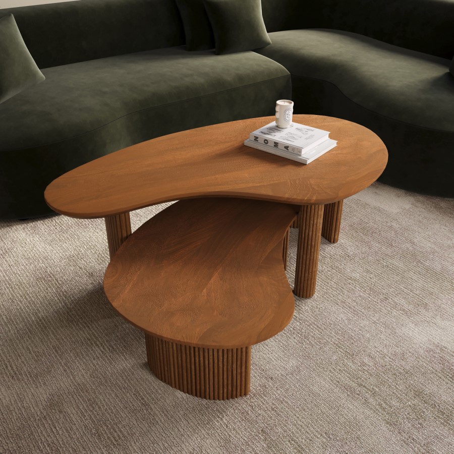 The Ivan Kidney Mango Wood Nesting Coffee Tables offer a perfect balance of modern elegance and functional design. This versatile set features two beautifully crafted tables, each with an organic kidney shape that adds a contemporary touch to any living space. Whether styled together for a layered look or used separately for added flexibility, this set effortlessly adapts to your needs.