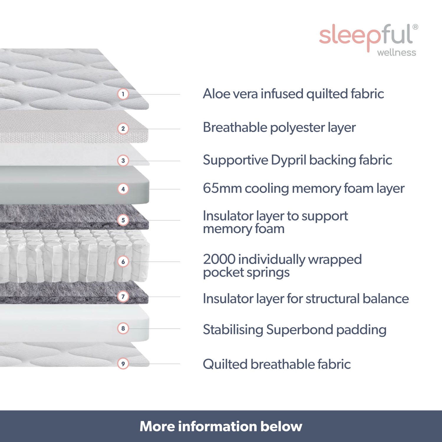 This Sleepful mattress is designed with a better night’s sleep in mind. 2000 pocket springs keep you supported to help relieve any aches and pains. The Aloe vera-infused cover may help protect and rejuvenate the skin. Infusing our cover with Aloe Vera also creates a cleaner and softer sleeping surface. The mattress provides contouring comfort with a memory foam layer that supports the natural shape of your body promoting proper circulation.