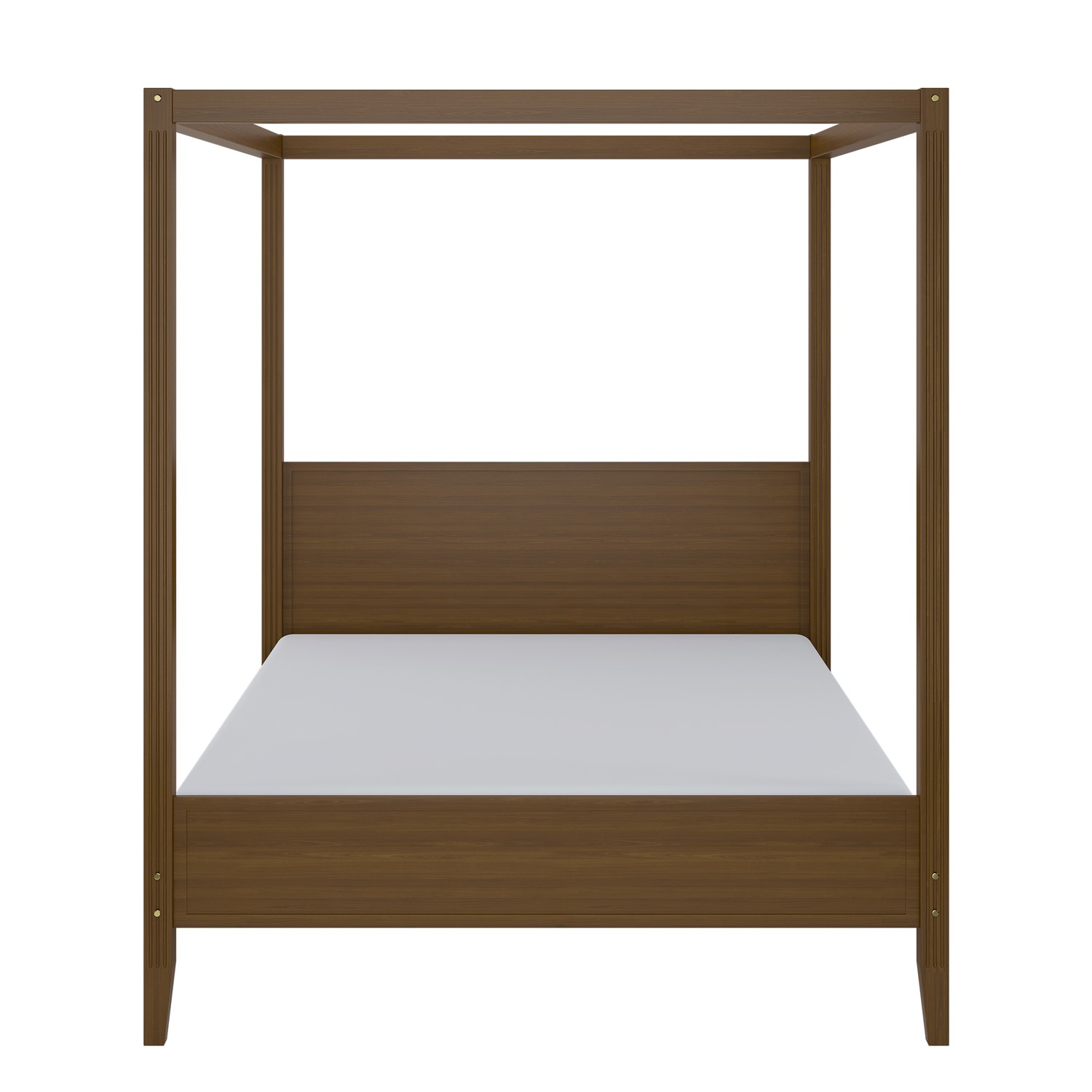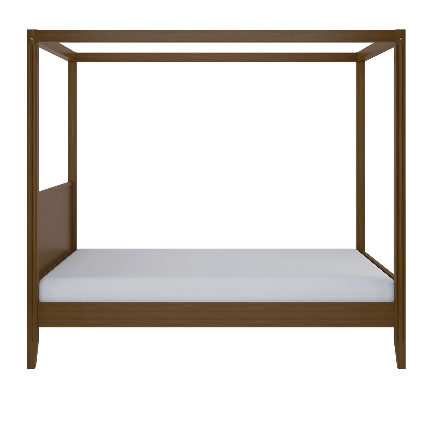 The Delilah Four Poster Bed Frame makes a classic statement, defined by its clean, structured silhouette. Crafted from solid pine and finished in a rich walnut tone, this timeless piece is a modern twist on a usually classic design. Sophisticated details elevate its appeal, with fluted sides and subtle golden accents adding a refined layer of elegance. The built-in headboard maintains a seamless, polished look, while the raised base reveals generous underbed storage. Complete with a sturdy slatted base, Delilah ensures both support and a restful night’s sleep.