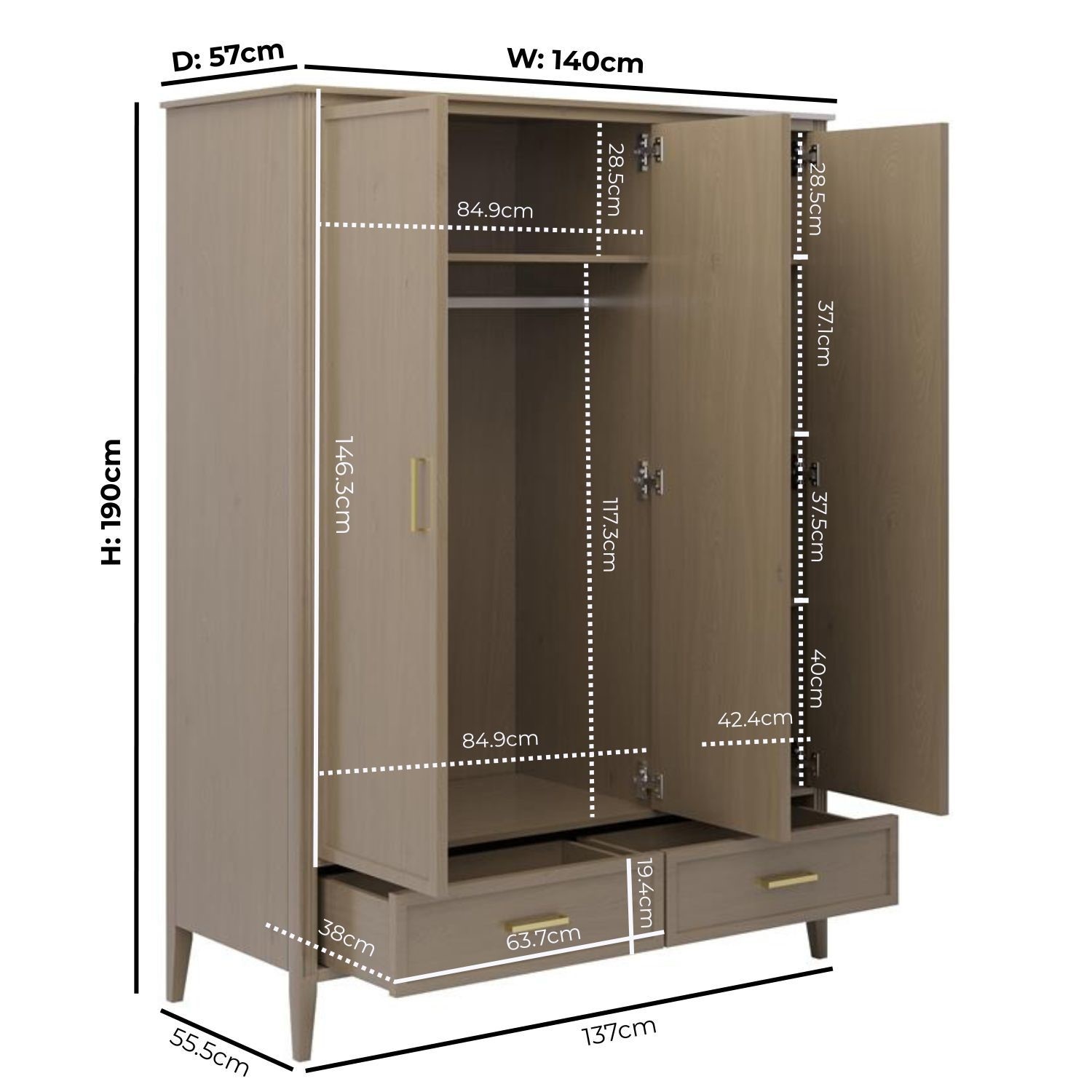 - Dimensions: W140 x D57 x H190cm