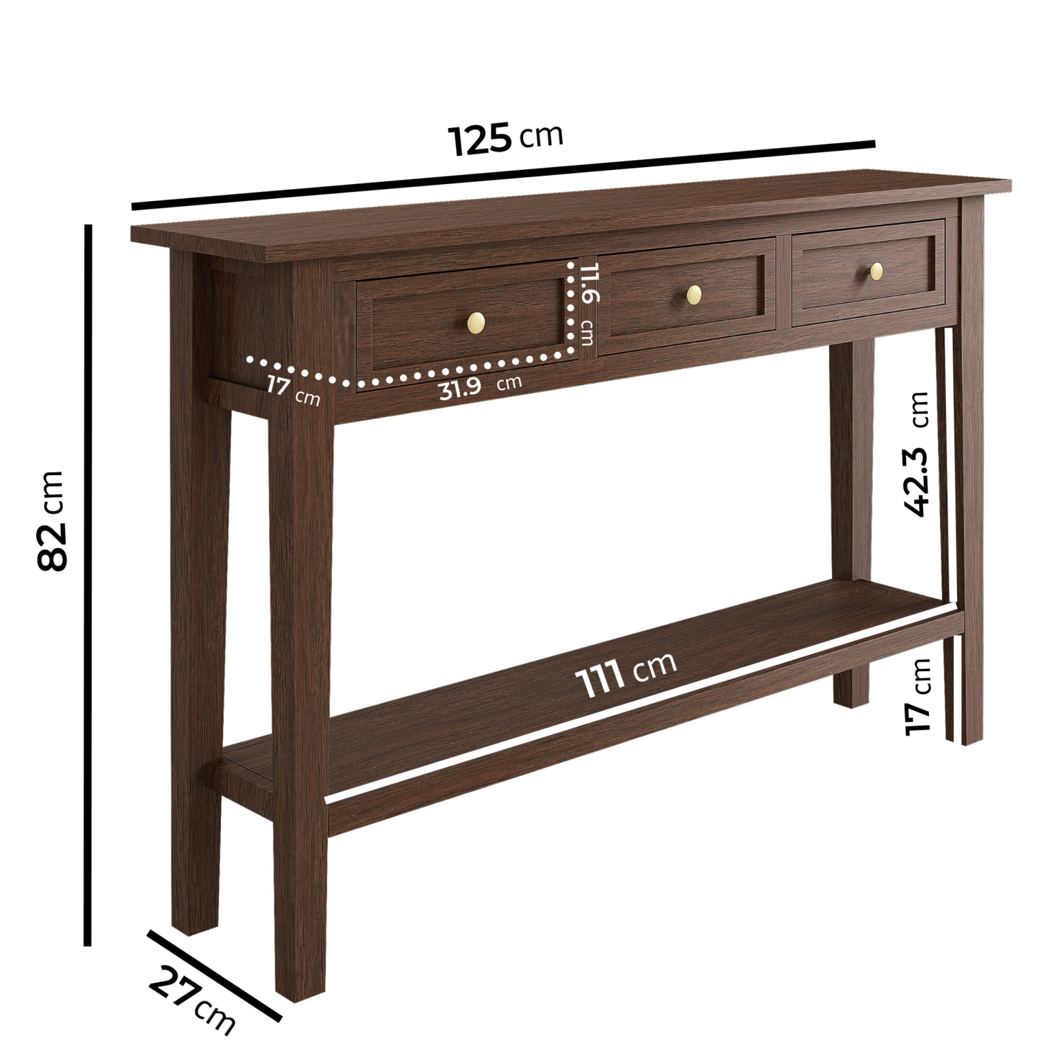 Maximise your space, and discover the perfect finishing touch for any hallway. This compact design console table has been beautifully finished in a walnut stain with two elegant handles, to complement any room themes and colour palettes. Pick and choose how or where you store your items across three levels of convenient storage; on the top, concealed behind drawers or on the lower shelf. Choose from silver and gold handles, giving you the flexibility to choose the handle colour that best complements your rooms aesthetic during assembly.