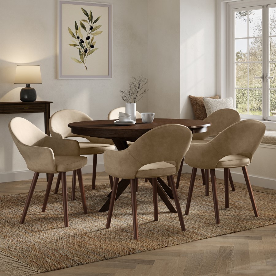 Paired with beige faux leather chairs making it the ideal combination of style and versatility, suiting a dining room setting or as occasion chairs for bedrooms and more. Sophisticated in their design, they can provide the finishing touch you've been striving for. Upholstered in a beige faux leather and finished off with sleek walnut legs, these chairs offer a timeless design and comfortable dining experience.