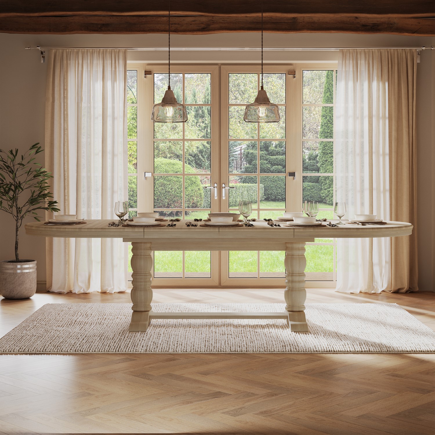 A beautifully crafted farmhouse dining table in solid pine with a washed rustic finish. Featuring elegant turned legs and a cool-toned wood surface, it combines timeless style with everyday practicality. The extendable design with two leaves adapts effortlessly to your needs, seating 6 when closed, 8 with one leaf, and up to 10–12 when fully extended. Perfect for family meals or special gatherings, this hand-finished table brings a natural, handcrafted warmth that complements both modern and rustic interiors.