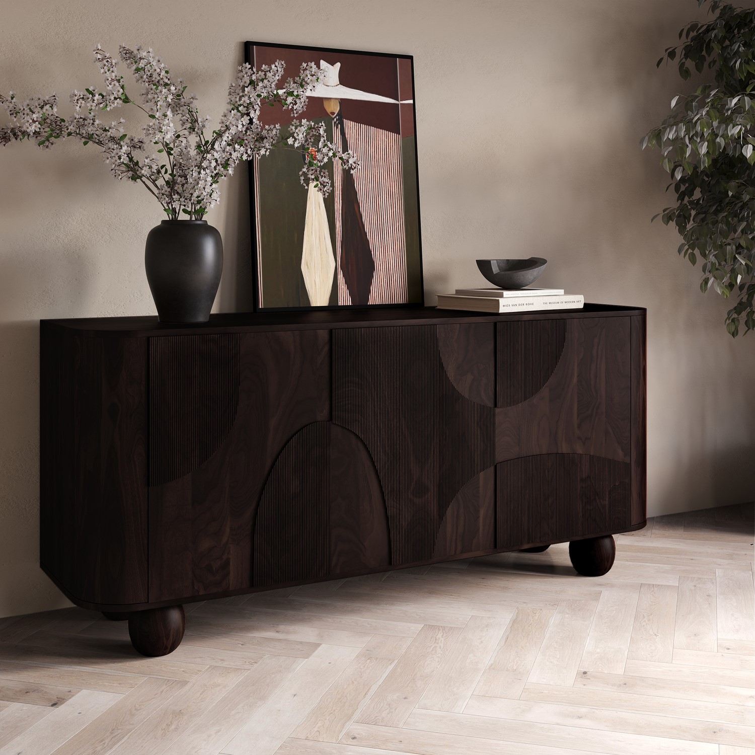 Ribbed Front Detailing: The hand-carved ribbed design across the three doors adds a textured, modern touch to this statement piece.