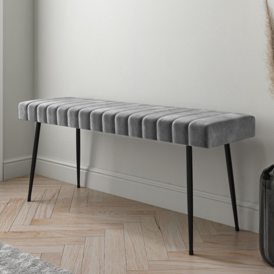 Complete your hallway with the Logan grey velvet hallway bench. With an on trend design, the styling is effortless. Finished in grey velvet and black metal legs, the two tone design brings a fresh look to your space with a modern touch.