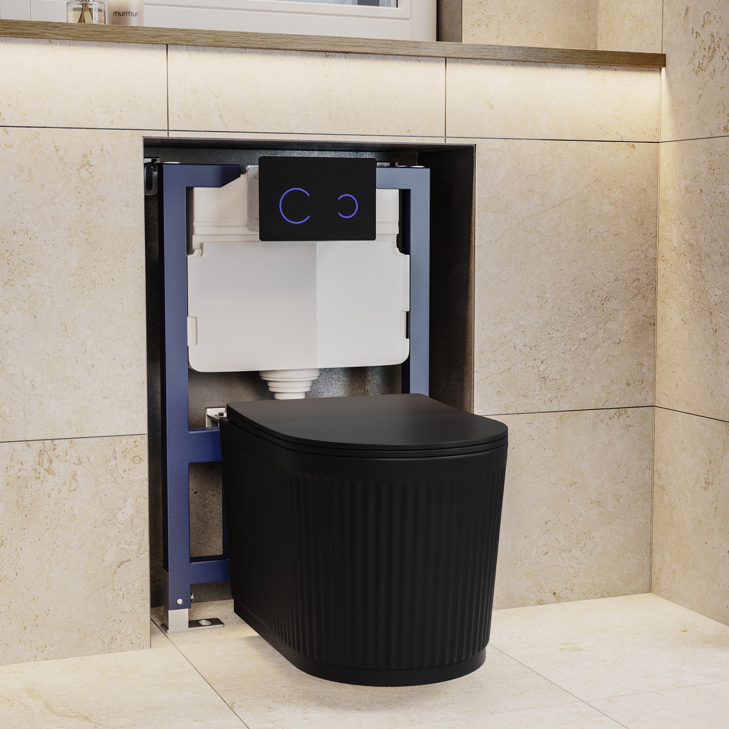Upgrade your bathroom with the Oregon Wall Hung Toilet in matt black. This elegant, wall-mounted toilet is designed to save space and add sophistication to any bathroom. The toilet features a beautifully crafted fluted design on its ceramic body, adding texture and a touch of modern elegance. Its tornado also known as vortex flush technology ensures efficient, quiet flushing while keeping water use to a minimum. The toilet's durable ceramic body and rimless design make it easy to maintain, and the included soft-close seat provides smooth, quiet operation.