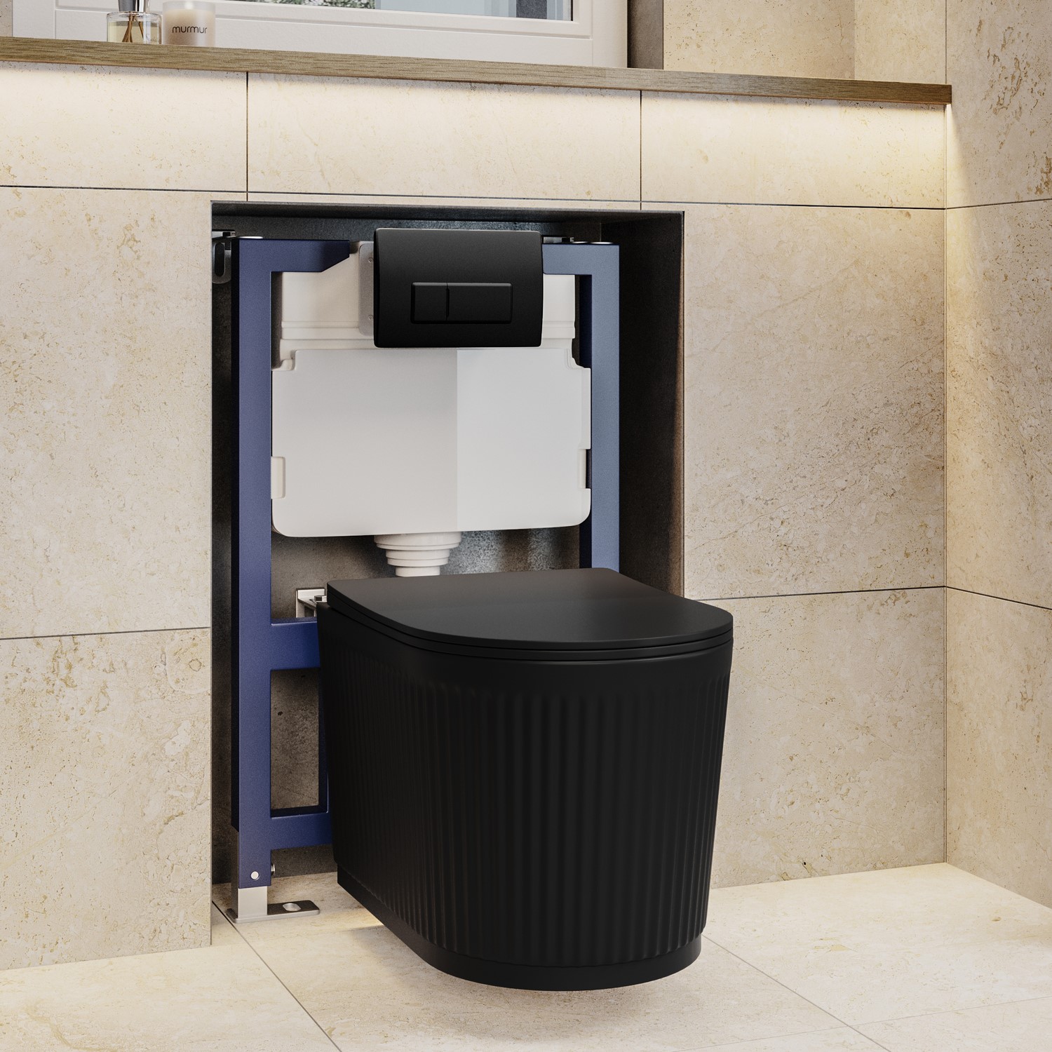 Contemporary Wall-Hung Design: The sleek Oregon Wall Hung Toilet in matt black adds modern style and saves space. The fluted/ribbed detailing on the ceramic body enhances the design, creating a unique and luxurious look. The seat has matching black hinges, making it easy to coordinate with your bathroom theme.