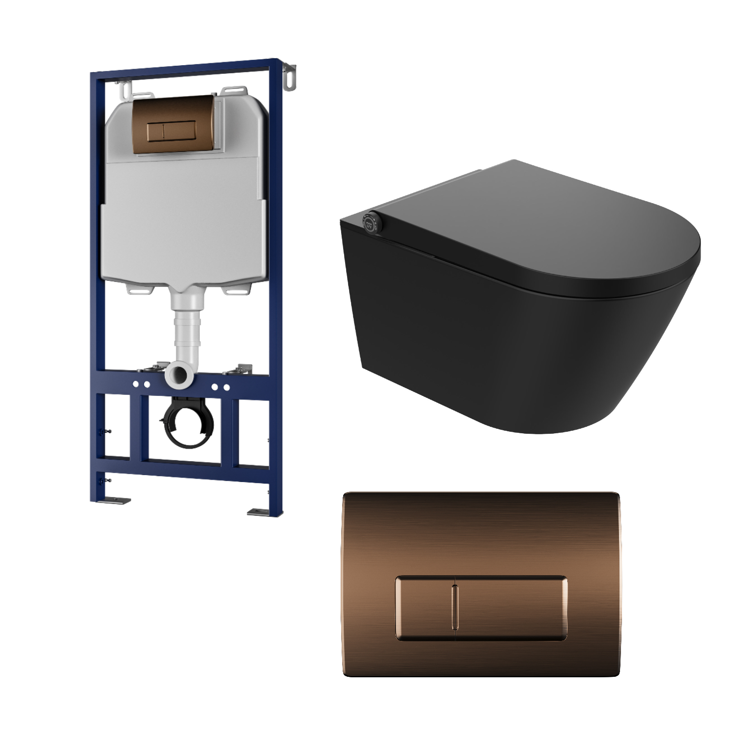 Upgrade your bathroom with this complete Purificare Smart Wall Hung Toilet Set, including a matt black smart toilet, concealed frame, cistern, and brushed bronze flush plate—perfectly combining cutting-edge technology with modern design.