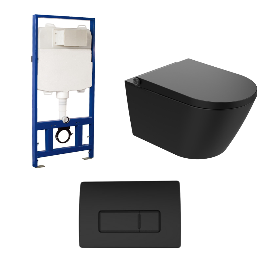 Upgrade your bathroom with this complete Purificare Smart Wall Hung Toilet Set, including a matt black smart toilet, concealed frame, cistern, and matt black flush plate—perfectly combining cutting-edge technology with modern design.
