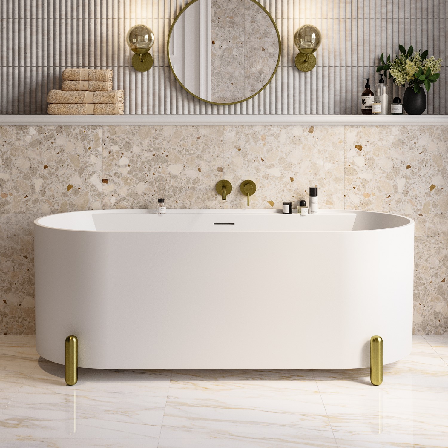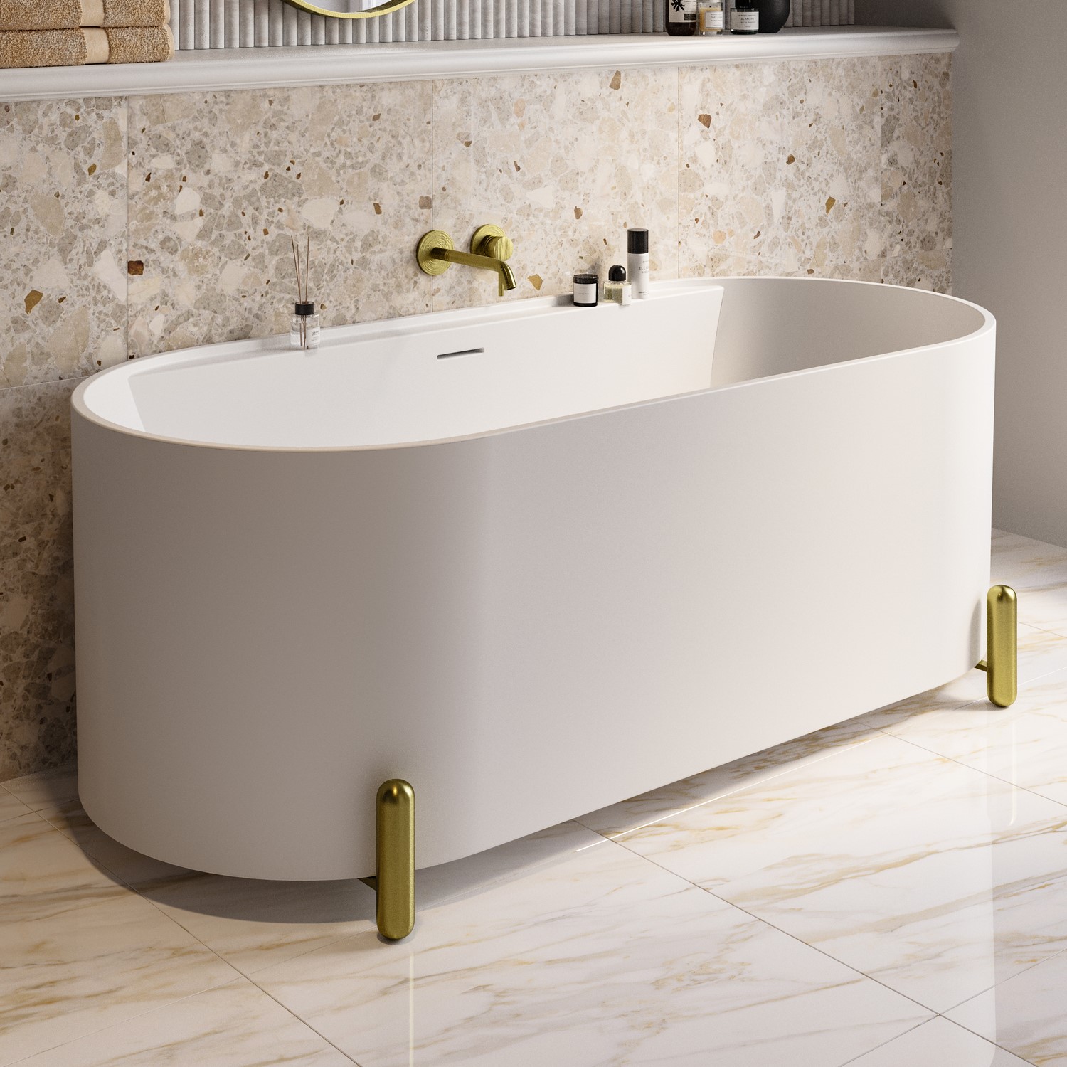 Sleek Details: Laser-cut overflow and coordinating matt white waste create a seamless, minimalist finish that complements any brassware choice, paired with brushed brass stainless steel modern bath feet for a striking contrast and durable support.