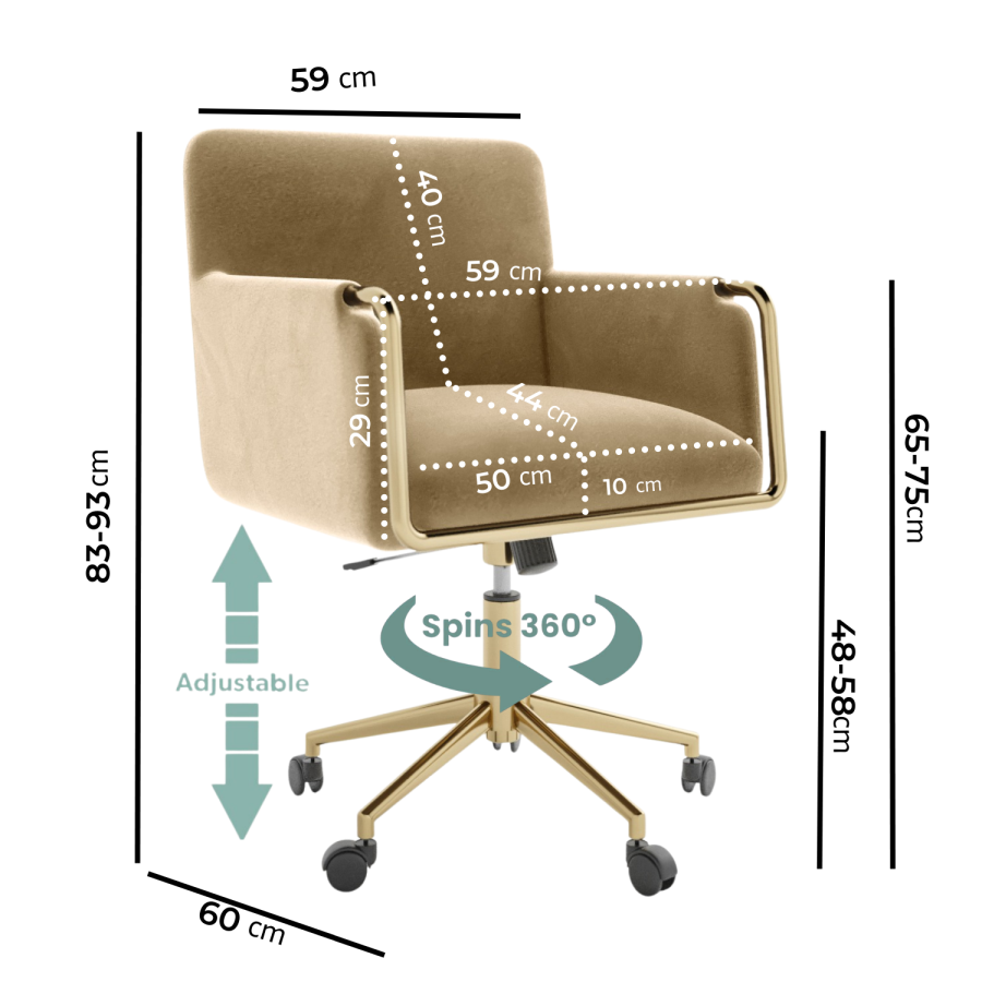 Built with comfort and convenience in mind, this sleek office chair would enhance any office or home study. It features five wheels with castors which give you a 360⁰ degree swivel and freedom whilst you work. Plus, you can set it to the perfect working height with the gas-lift mechanism. Upholstered in a soft-to-touch velvet and contrasting polished gold base, it's versatile enough to coordinate with existing furniture.
