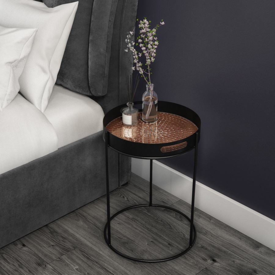 This Nea bedside table with removable tray top makes the perfect focal point thanks to the beautiful bronze mirror mosaic inlaid top which rests atop a sleek circular-shaped iron frame finished in black. It makes a versatile addition to your bedroom as a nightstand, as well as your living room or dining space as an accent table.