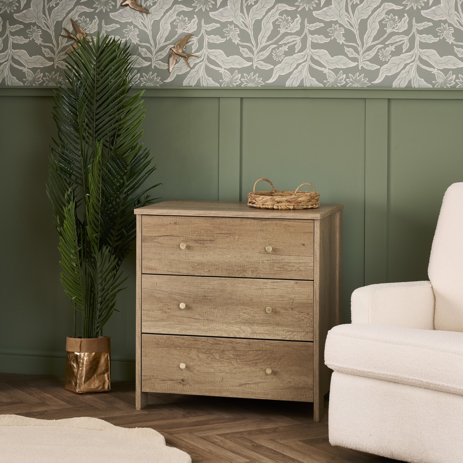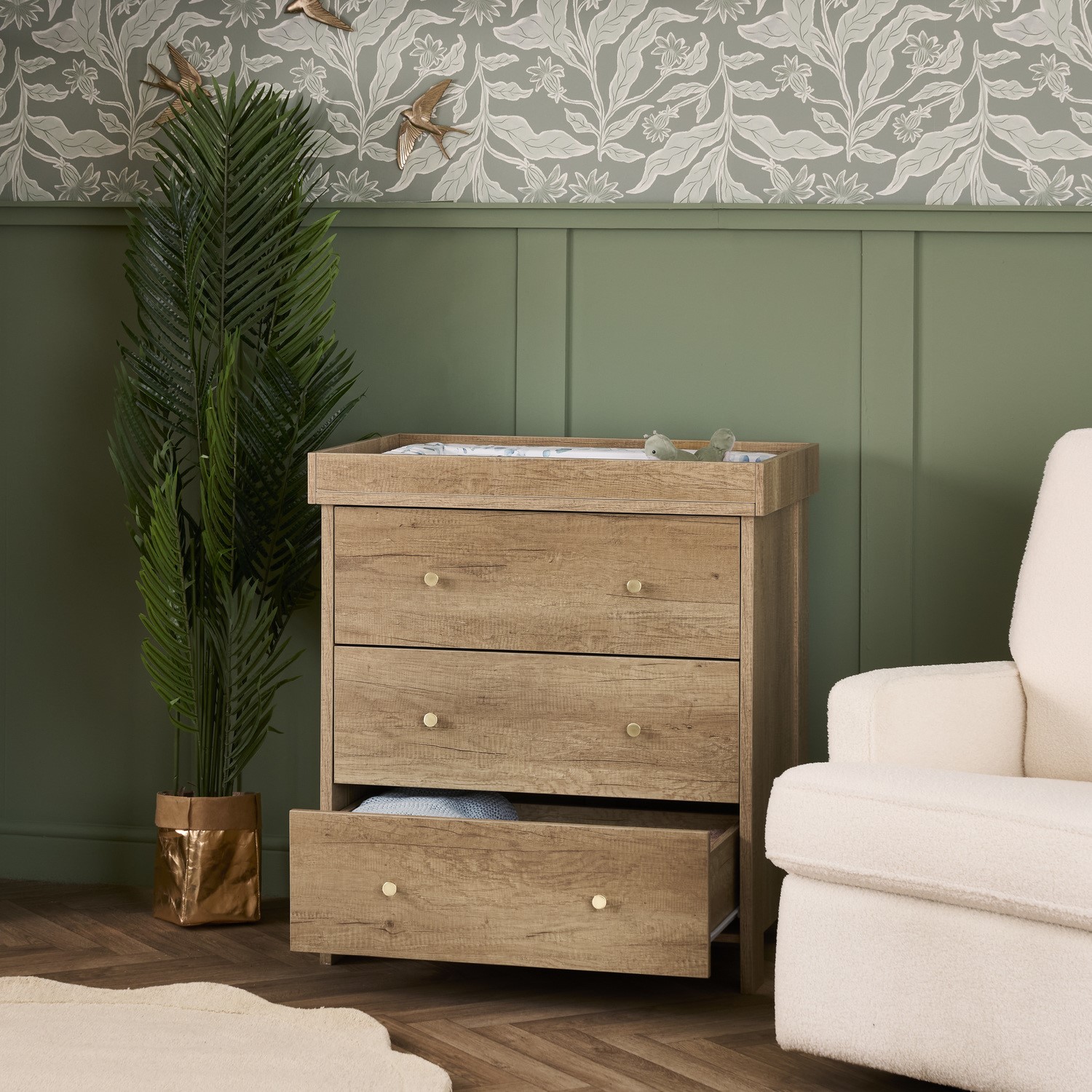 The Nika Changing Unit is a beautiful and practical addition to any nursery. It offers a perfect blend of convenience, storage, and contemporary design. With its oak wood-effect finish, gold handles, and spacious changing area, it keeps essentials neatly organised and within easy reach. Three full-depth drawers on smooth-gliding runners provide generous storage, while the ideal height ensures comfortable, stress-free changing. The removable top transforms it into a timeless chest of drawers, making it a stylish and long-lasting piece for any room in your home.