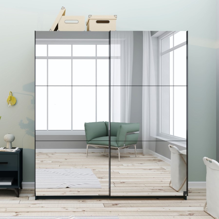 The Norvik sliding door wardrobe is designed with strength and durability in mind that features a matte anthracite grey carcass with two panelled mirrored sliding doors. The mirrored door allows light to reflect around the room to create a fresh, open feel. This wardrobe has two sliding doors so it takes up less room than a conventional hinged 2 door robe that requires extra space for the doors to open. Furthermore, the sliding doors do not require knobs or handles. This creates a timeless expression that is easy to combine with different styles.