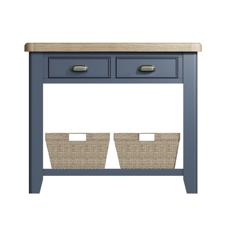 This chunky rich blue and oak console table will add rustic charm to room. Featuring 2 storage drawers and 2 wicker baskets, it is an ideal storage solution. Finished in a rich blue and warm oak finish and rounded corners, this collection brings a sumptuous and elegant traditional style that is set to compliment any interior. Impressive quality run through every detail of this range, from the thick oak tops and solid proportions through to the smooth gliding soft close drawers