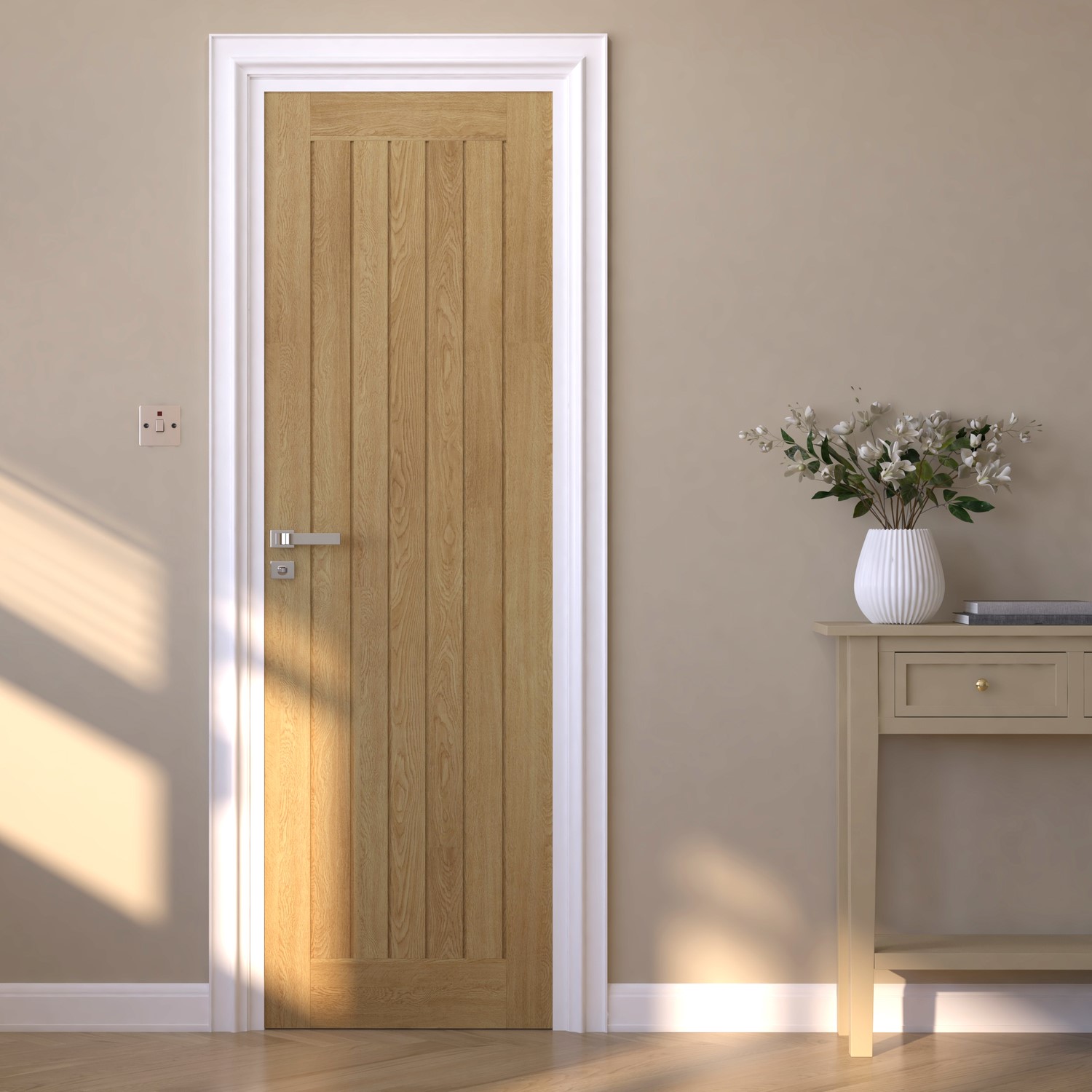 Add a touch of rustic elegance to your home with this premium heritage-style cottage door, designed to bring warmth and character to any room. Crafted from real oak veneer for an authentic, high-quality finish, the classic five-panel design features a tongue and groove detail, adding depth and character to any interior space.