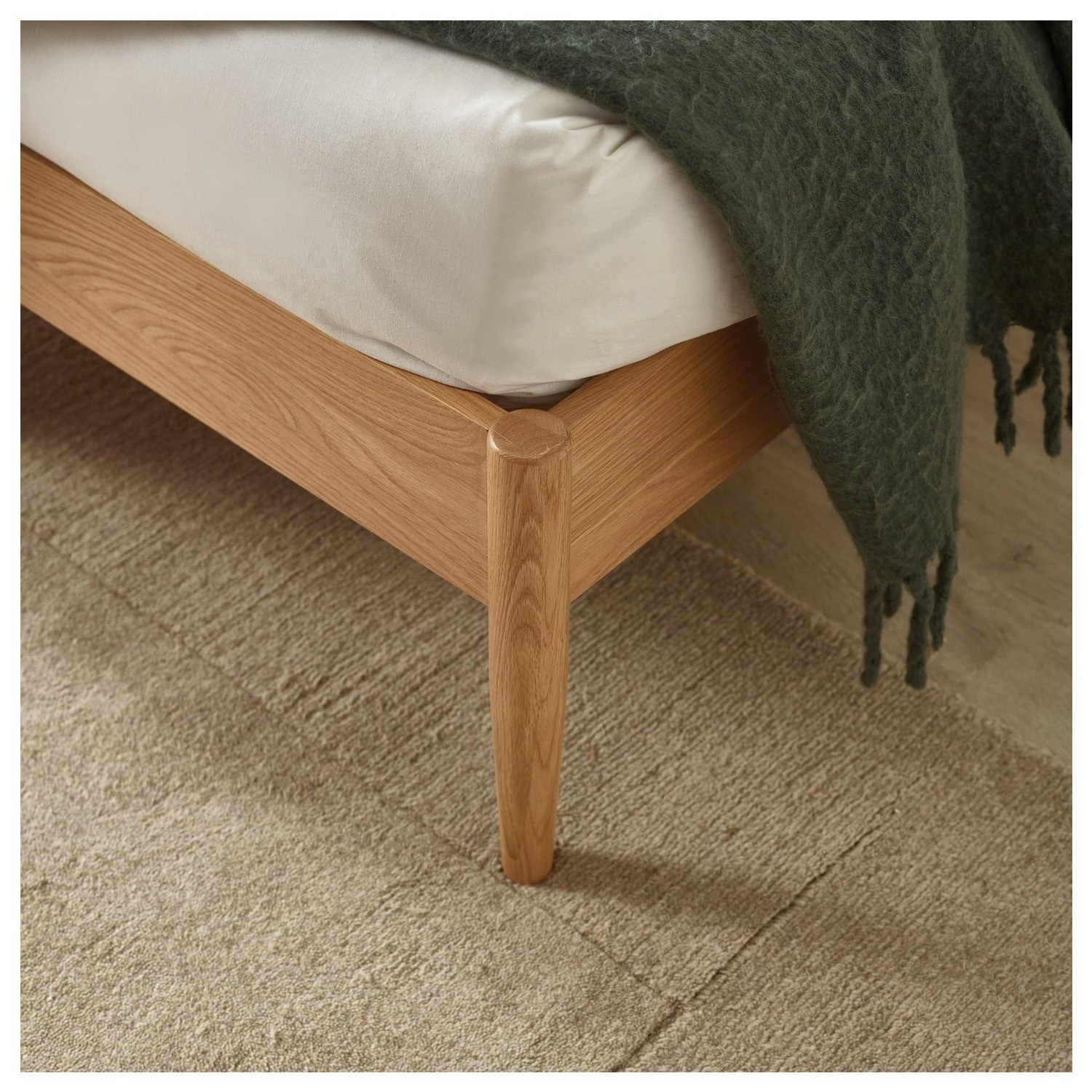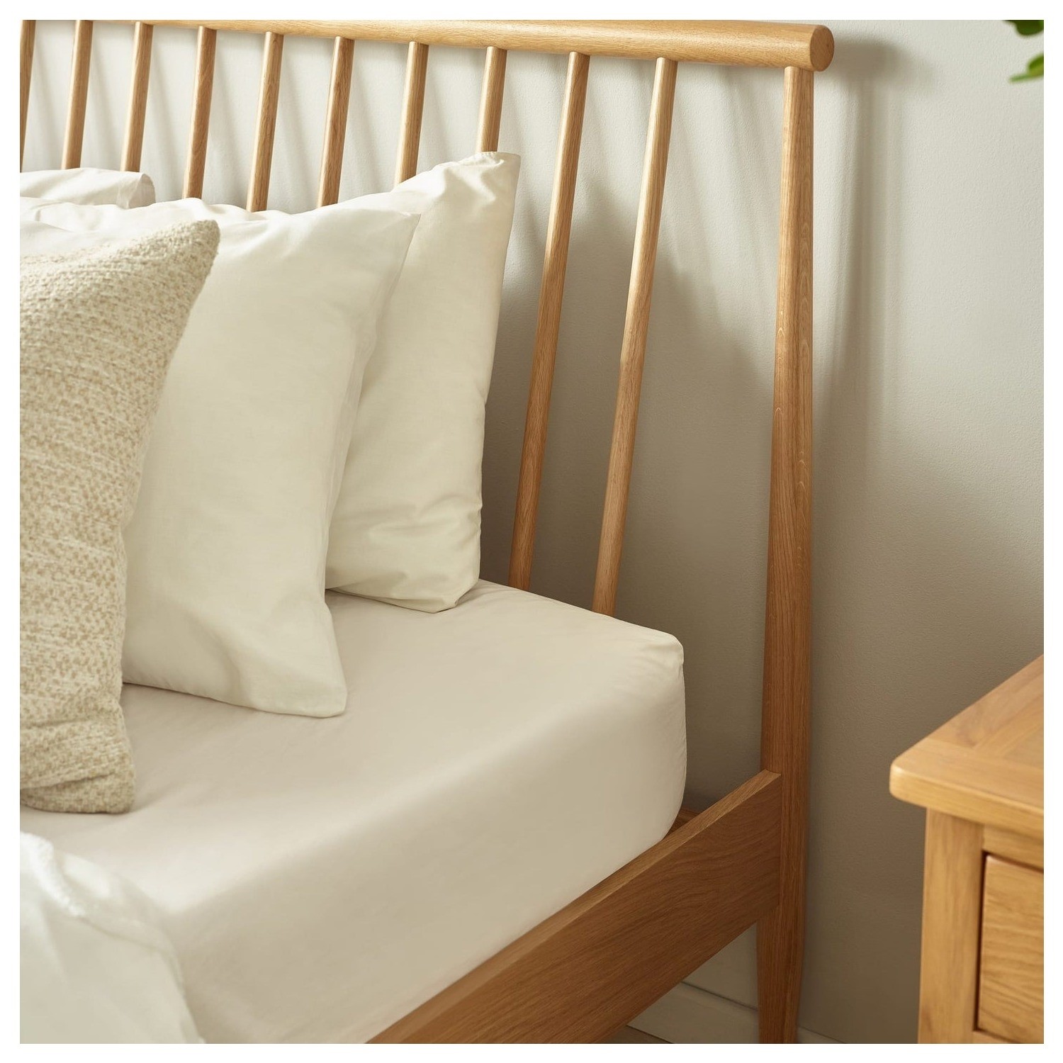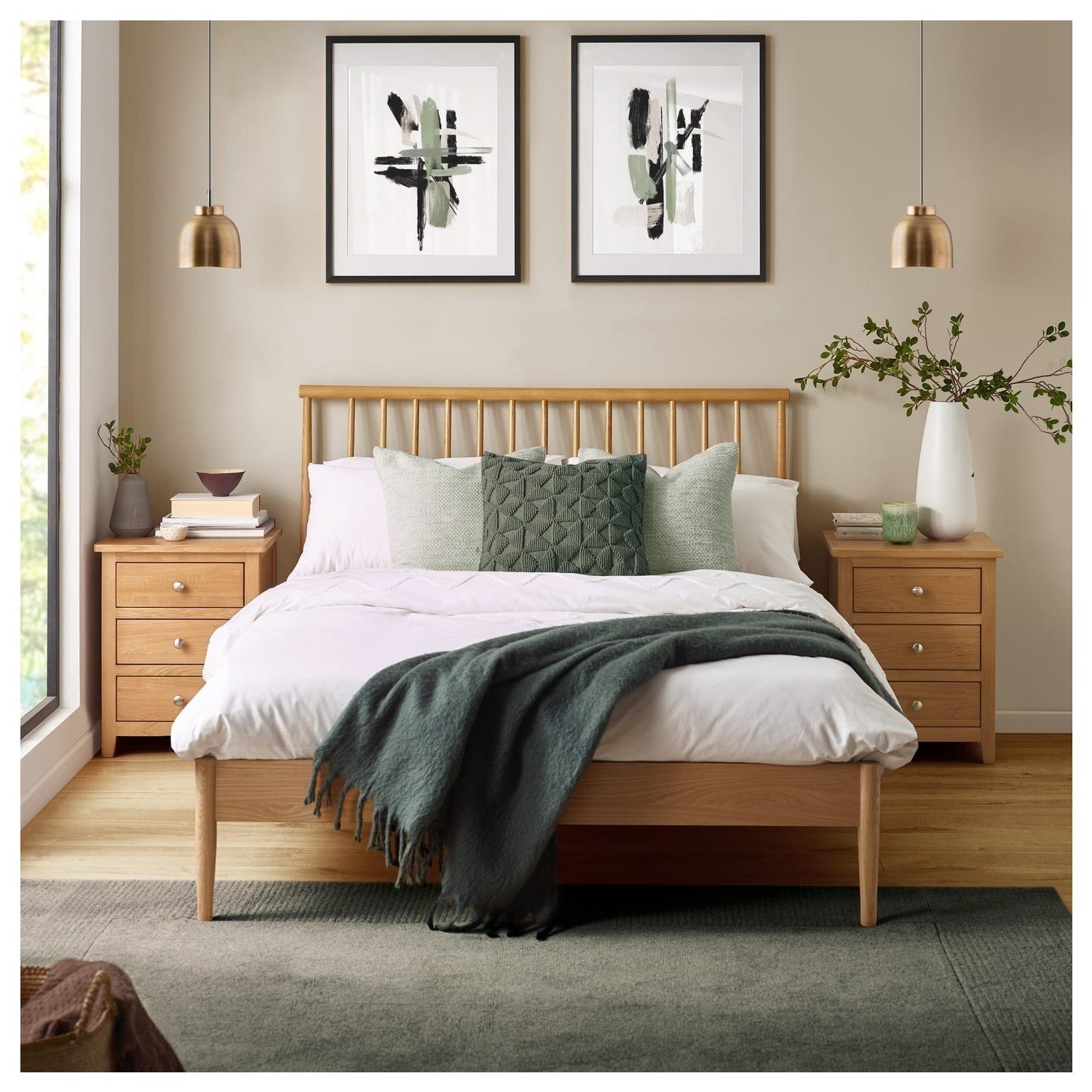 Experience effortless style with this 135cm oak spindle bed. The gently slanted spindles give the headboard a light, airy feel, while the rich, solid oak frame adds warmth and character. Its minimalist design and tapered legs make it a versatile choice that suits both modern and classic interiors. The sturdy slatted base provides excellent mattress support, making this bed as practical as it is eye-catching. Minimal assembly required. Mattress sold separately.