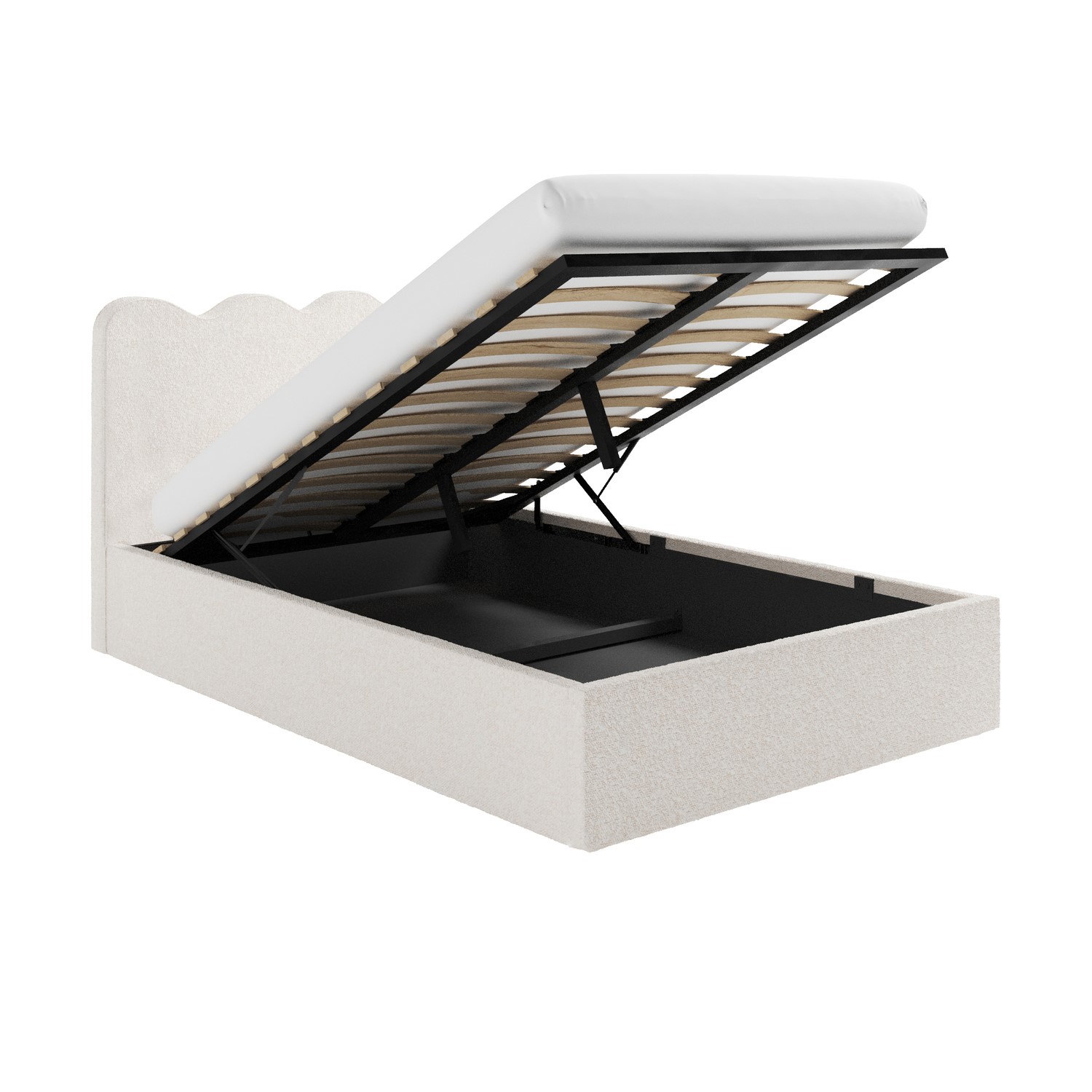 The Boba small double ottoman bed is crafted to enhance your bedrooms aesthetic, while creating a cosy ambiance. This luxurious bed is upholstered in a soft cream boucle fabric and features a contemporary wavy headboard for an extra touch. The Boba bed features a spacious ottoman storage area, offering plenty of space of clothes, bedding and more. Its sprung slatted base ensures optimal mattress support for a restful nights sleep. This bed fits a UK standard small double-size mattress.