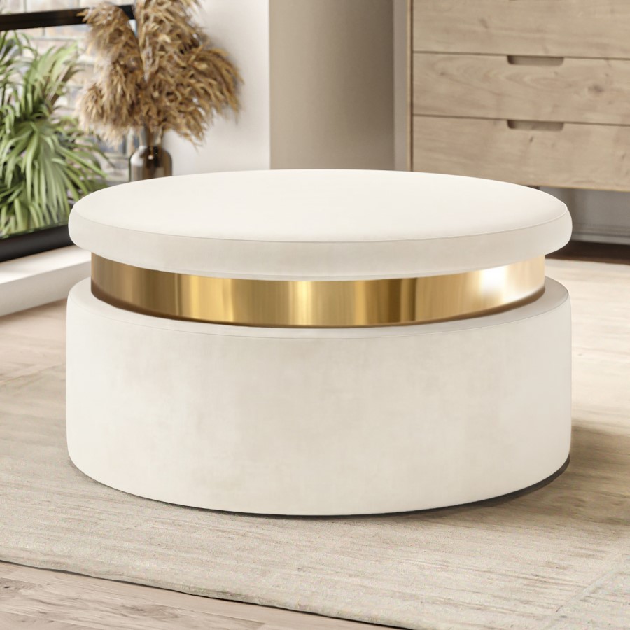 Use your storage pouffe as a footstool or stool in any living area, or even as a feature in your dressing room. The gold plinth brings the piece together and conceals the fastening. Simply lift the lid to reveal the storage compartment.
