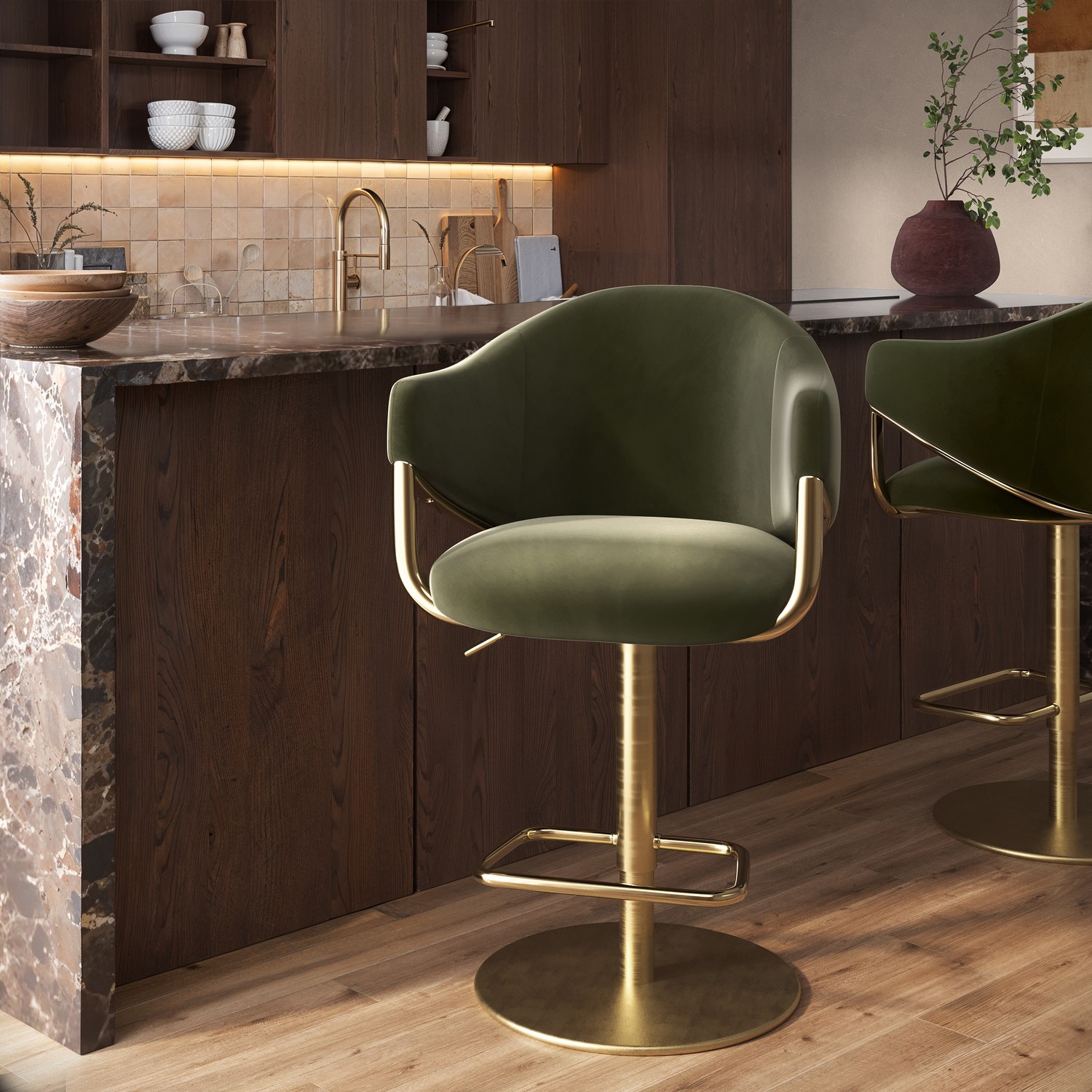 Luxurious Upholstery: Crafted with soft olive green velvet, this barstool adds a warm and elegant touch to any space.