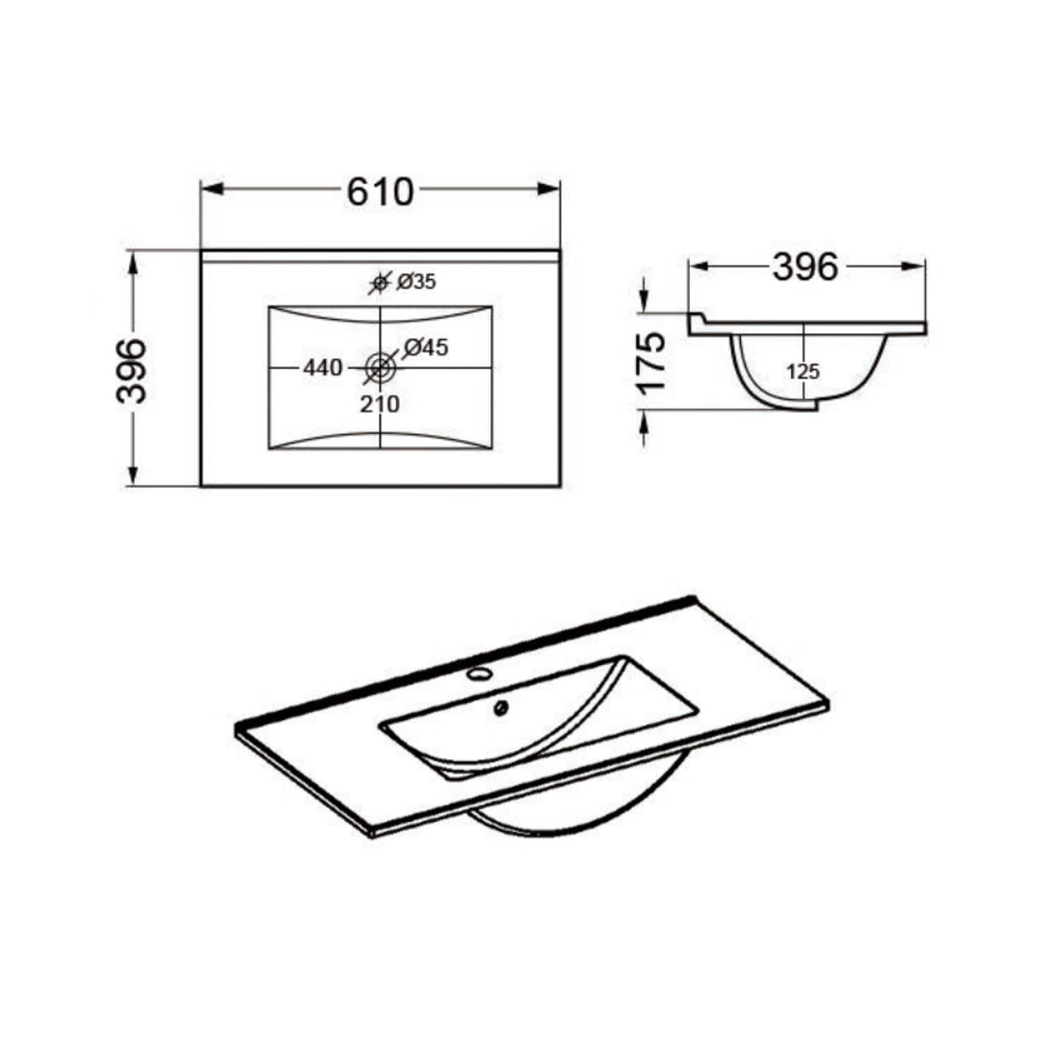 - Overall Basin Vanity Dimensions (including basin): W610 x H856 x D396 mm (the vanity footprint is W600 x H850 x D390mm)