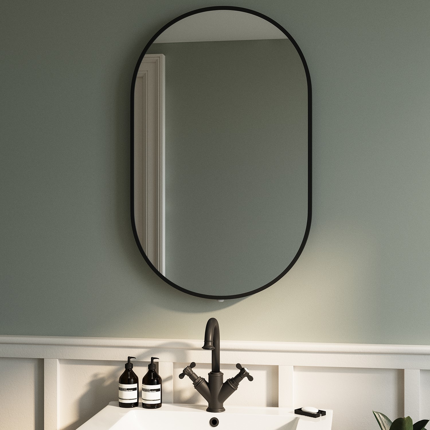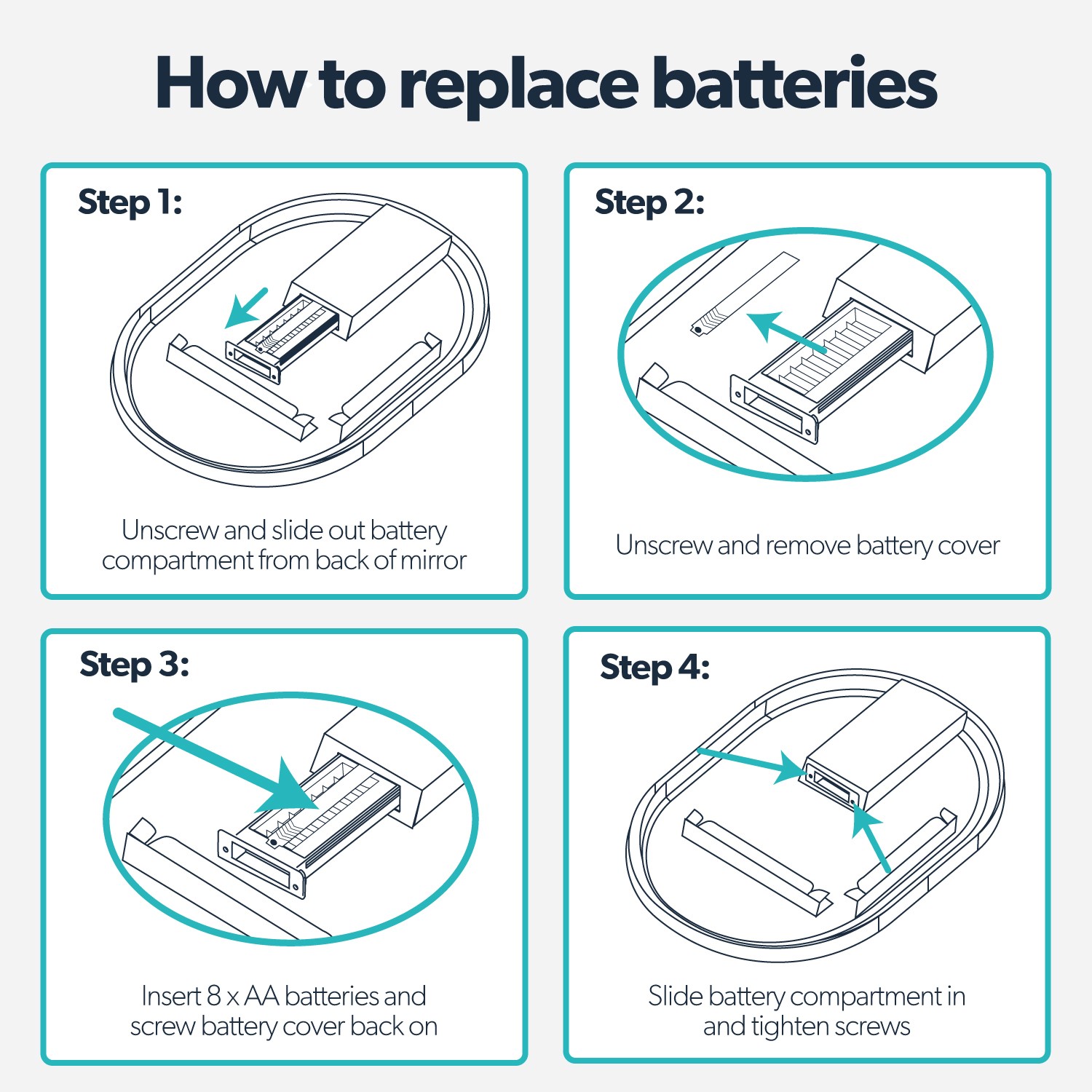 The battery compartment is cleverly positioned on the back of the mirror. Simply remove the cover from the battery box, insert 8 AA 1.5 V batteries (not included), and reattach the cover. The convenient rocker switch, located at the bottom centre when mounted in portrait orientation, allows easy operation of the backlit feature. This battery operated bathroom mirror is IP44 rated, making it perfectly safe for bathroom use. The oval design with its slim 10mm matt black frame adds a contemporary touch whilst providing excellent illumination for your daily routine.