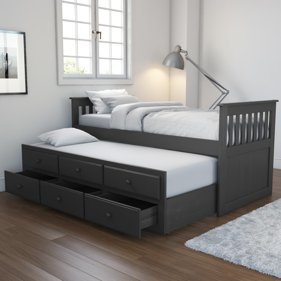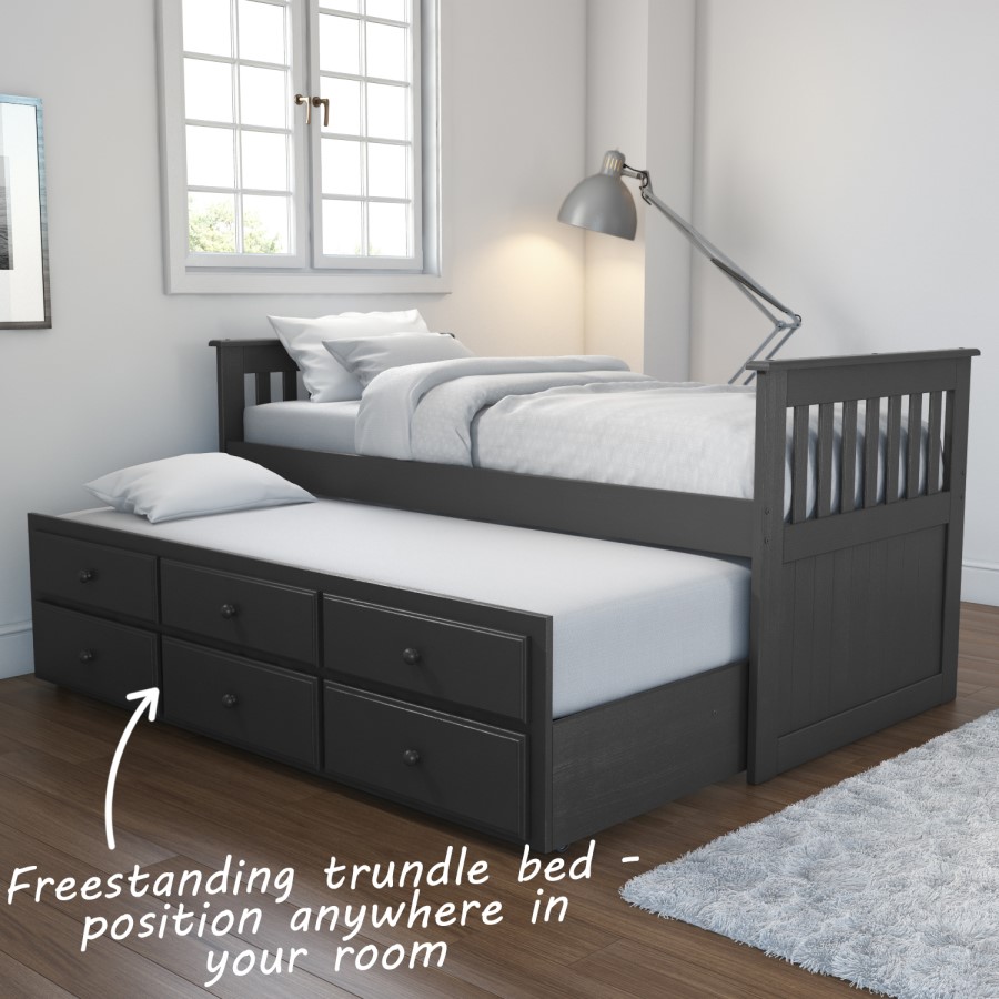 When space is at a premium the Oxford Captain bed is the perfect choice. With a discreet trundle bed neatly disguised by 3 storage drawers and 3 dummy drawers which act as handles, you're always prepared for guests whilst maintaining floor space and a neat exterior. The classic design featuring a modern dark grey painted finish makes for a stylish child or teen bed, ready for any impromptu sleepovers.