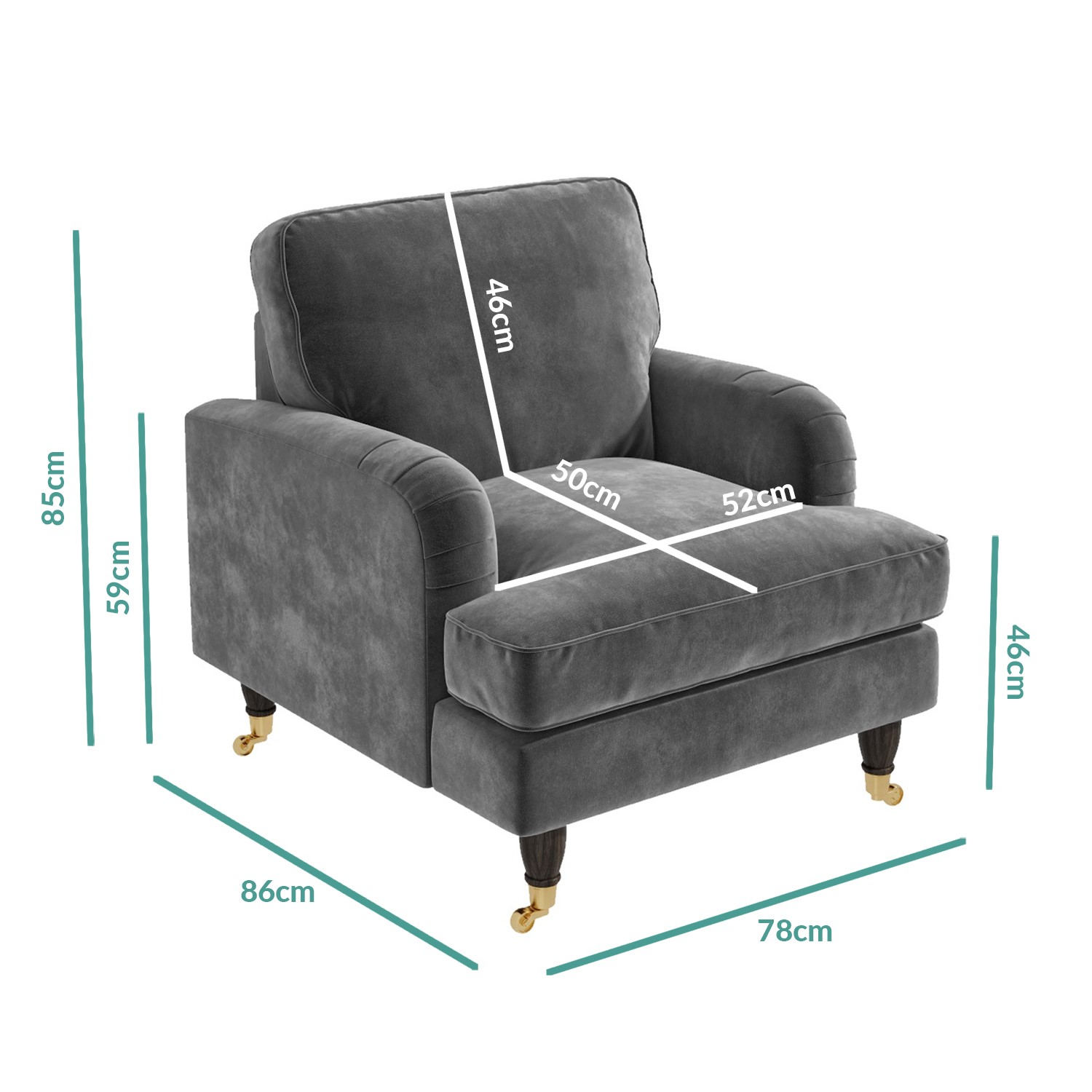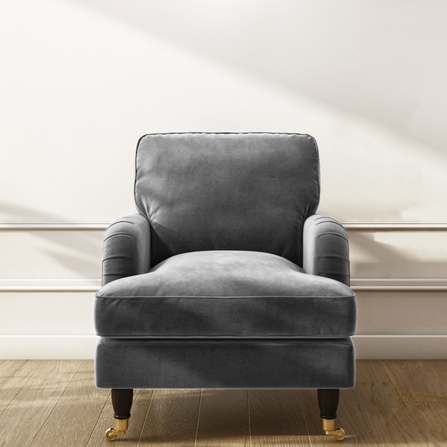 This armchair is Steel Grey and doesn't match exactly to the rest of the Payton Grey Range. Discover maximum comfort and minimum maintenance with this gorgeous armchair. This plush Payton armchair offers traditional styling with a modern twist thanks to its dark wooden legs with gold accent front castors and classic ruched saddle arms. Beautifully tailored and upholstered in Steel Grey velvet, making it the perfect statement piece.