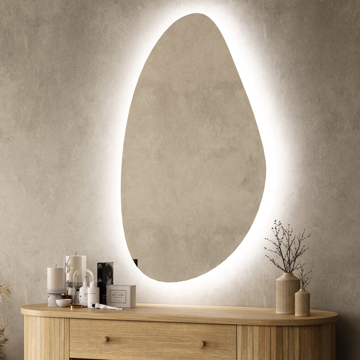 Give your space a new lease of life with this battery operated illuminated dressing room mirror. The Apollo's distinctive pebble shape brings an organic, irregular beauty. The mirror's large surface area makes it perfect for large dressing rooms, hallways and living rooms. The backlit light provides a cool ambient glow which is perfect for getting ready and doing your makeup. Since the mirror is battery powered you will save money on your electricity. The mirror can be installed anywhere you like with no wiring required. Not only is it simple to install, but it also comes with the appropriate screws and wall plugs. This pebble backlit mirror can be hung landscape or portrait for added versatility.