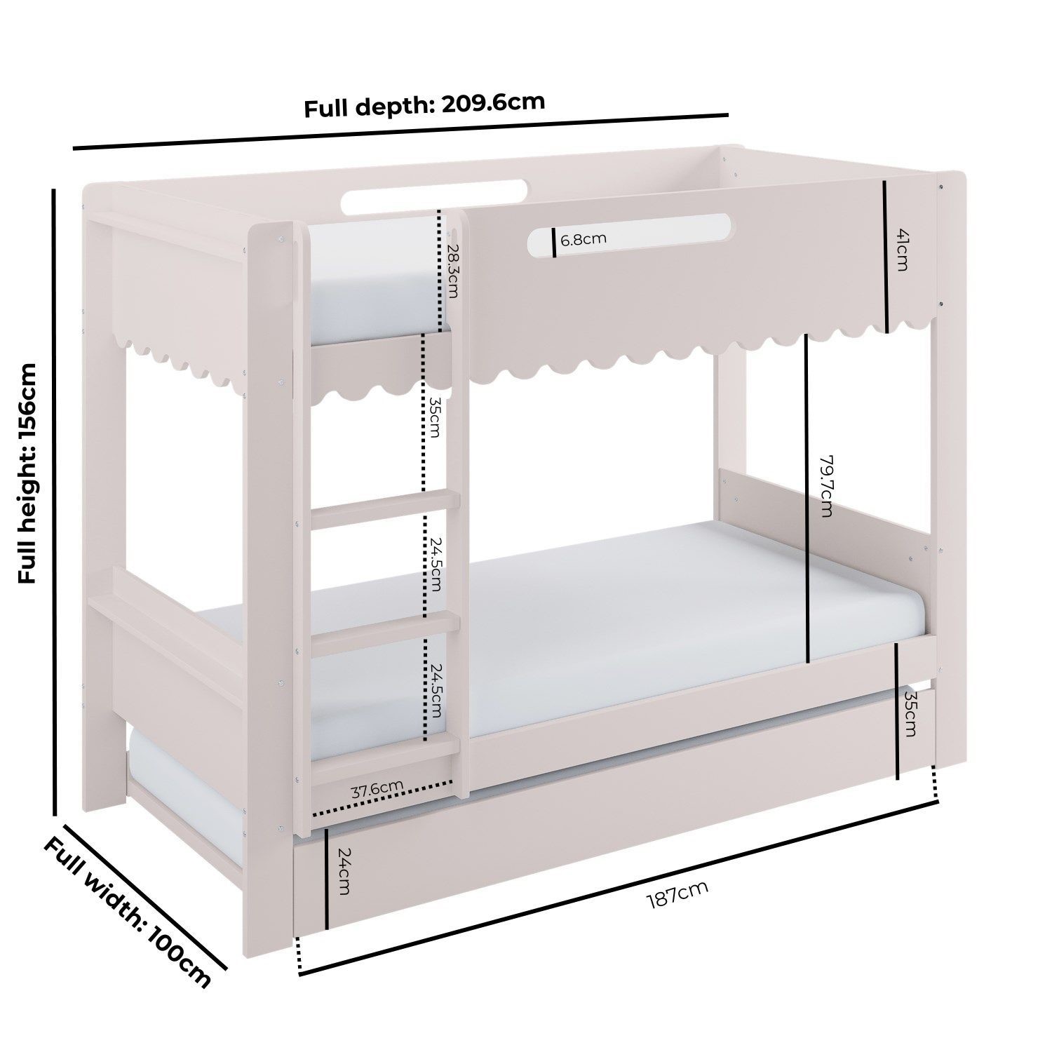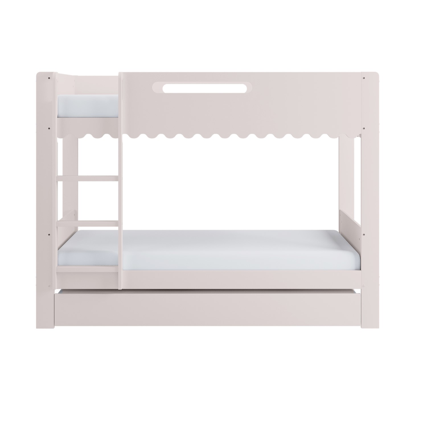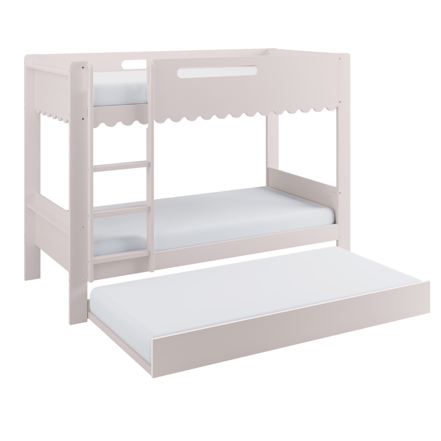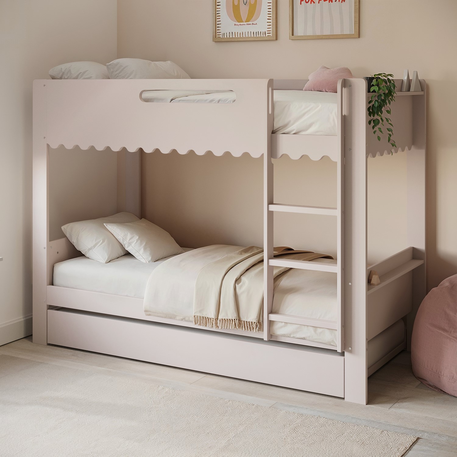 The Gracie Bunk Bed combines playful charm with modern practicality. Its scalloped detailing and softly curved silhouette are finished in a soft pink paint, creating a light, contemporary look. Designed as a space-saving triple sleeper with a pull-out trundle, it’s ideal for shared bedrooms or sleepovers. The fixed ladder, sturdy stairs, and robust guardrails ensure a safe and family-friendly sleep environment. Crafted from durable materials, this bunk bed is built to last.