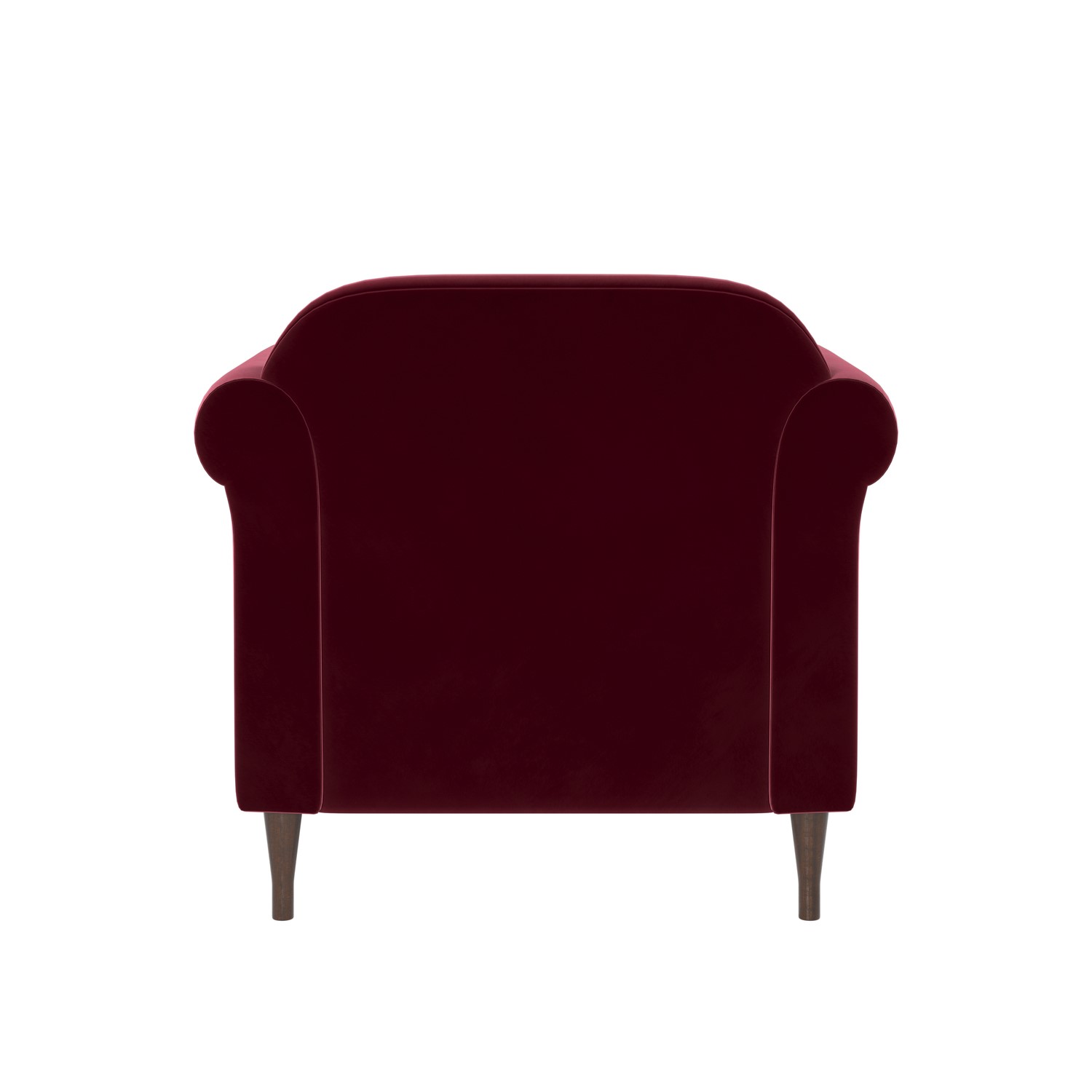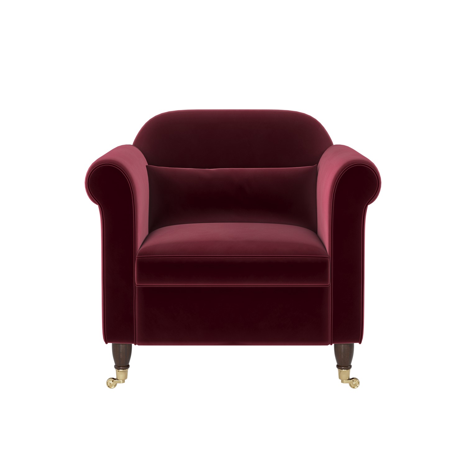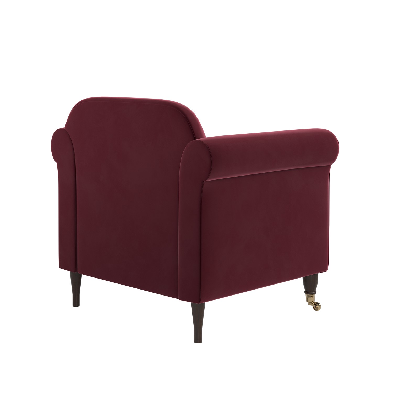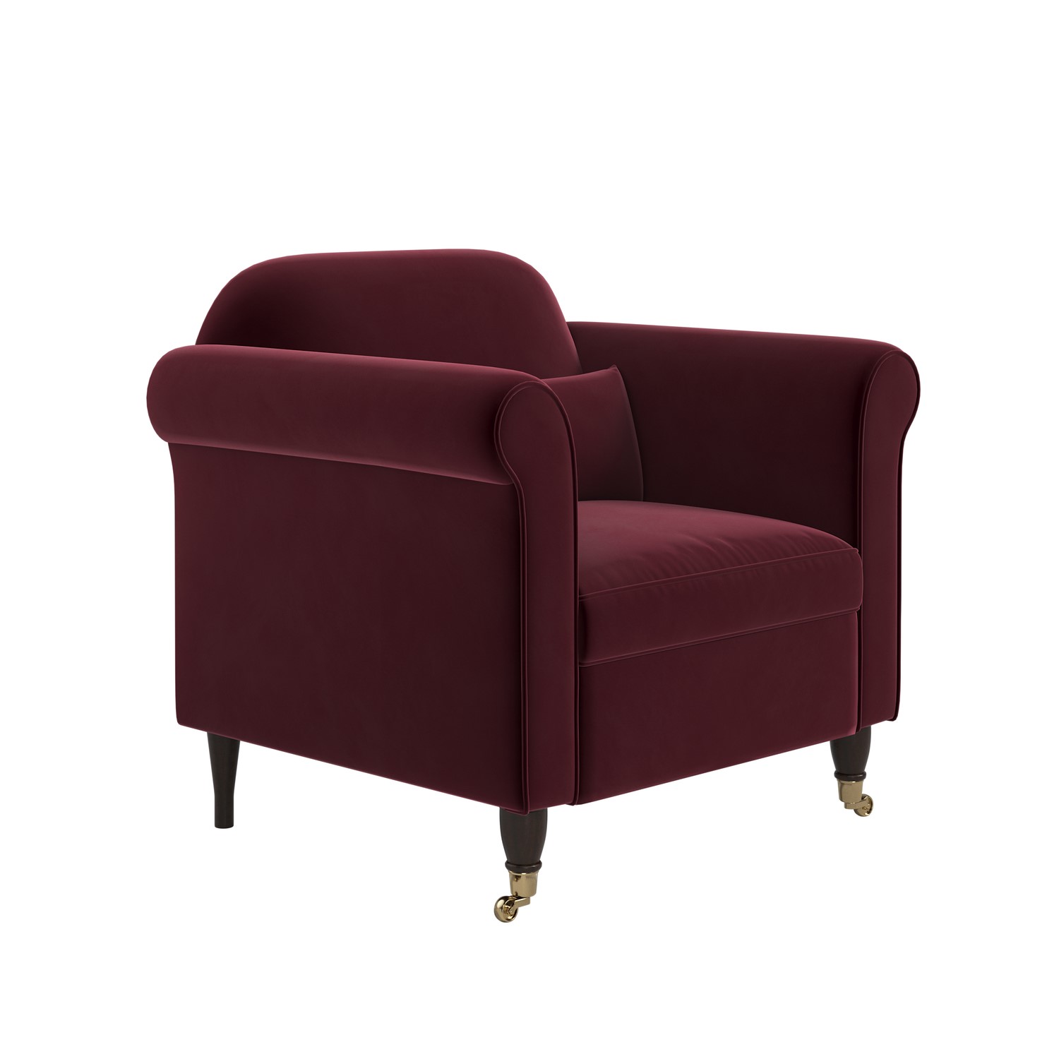 The Ramona armchair in burgundy velvet combines timeless elegance with everyday comfort, making it a standout piece for any living room or reading corner. Upholstered in elegant, durable burgundy velvet, it brings warmth, depth, and sophistication to your space. Featuring classic scroll arms, turned wooden legs with castors, and a gently curved silhouette, it beautifully blends traditional design with modern appeal. The foam and fibre-filled seat offers exceptional comfort and support, while the removable cushion cover ensures easy maintenance. Perfect as a statement piece or part of a coordinated set, the Ramona armchair adds charm, character, and lasting style to your home.