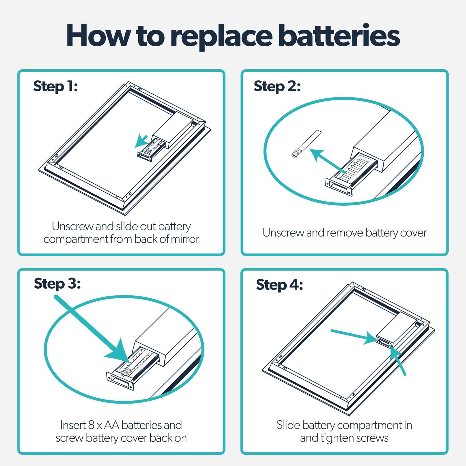 The battery box is conveniently located on the back of the mirror. Simply remove the cover from the battery compartment, insert 8 AA batteries (not included), then reattach the cover. In portrait installation, the rocker switch is conveniently positioned at the bottom right corner for easy access and operation. Use this to turn the mirror's lights on and off. This small battery powered mirror with lights is IP44 rated, making it perfectly safe for bathroom use. The frameless rectangular design is ideal for enhancing any space with minimal fuss, whilst still providing a sophisticated contemporary touch. For optimal performance, we recommend using high- capacity alkaline batteries. Using lower- capacity batteries may reduce brightness and shorten battery life.