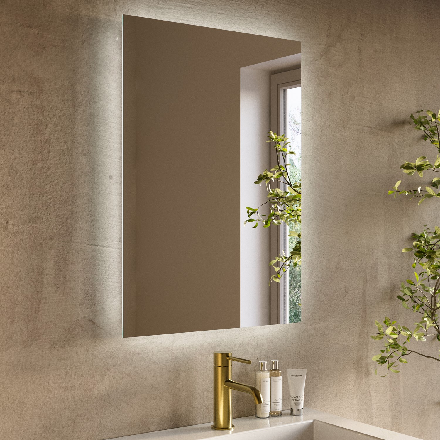Backlit Illumination: Cool backlighting highlights the mirror’s rectangular shape, enhancing its modern aesthetic.