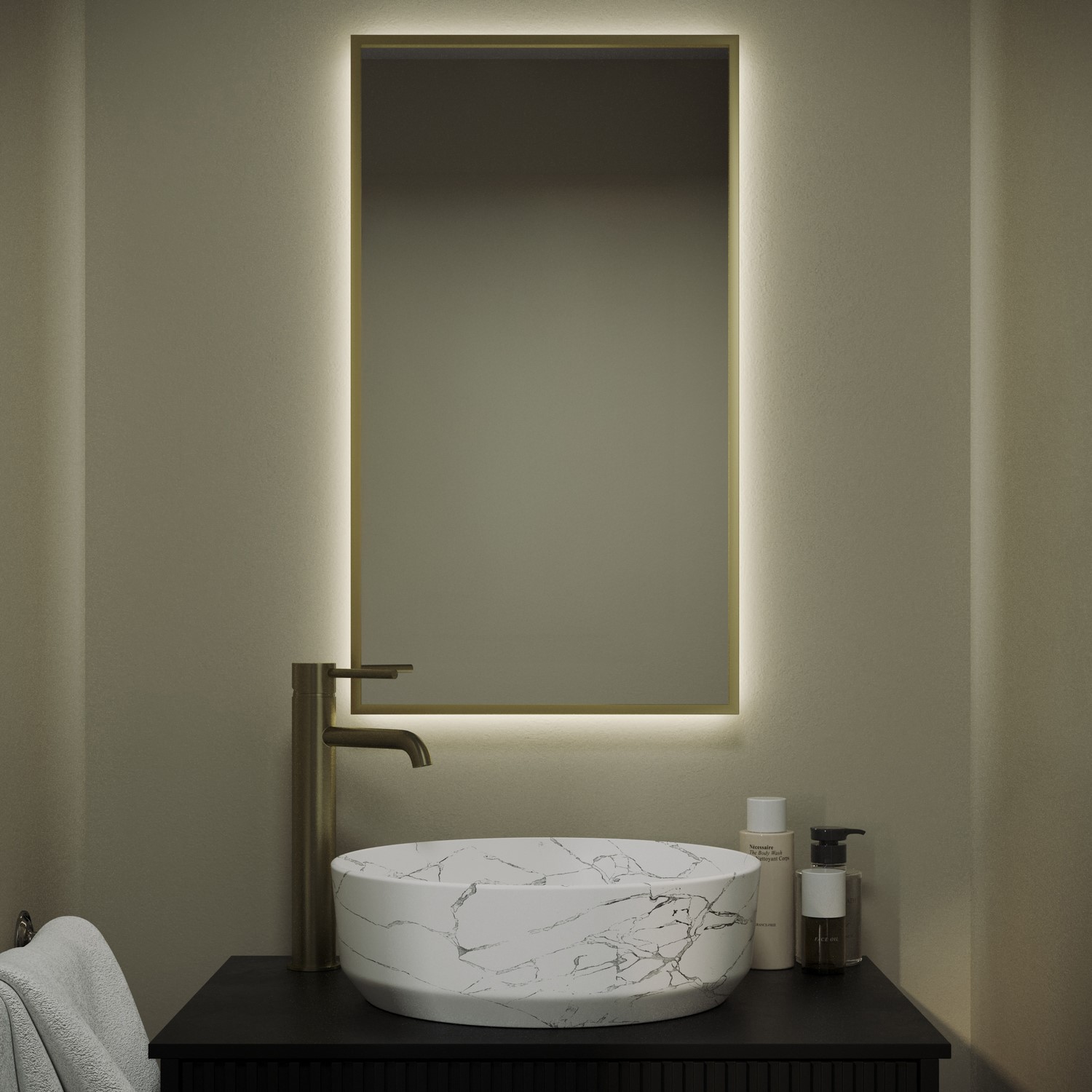 Perfect for cloakrooms or small bathrooms, the Taurus rectangular backlit mirror combines minimalist design with smart functionality. Its slim 10mm brushed brass frame adds a hint of warmth and luxury, designed to complement a wide range of interiors. With dimmable, colour-changing LED lighting, the Taurus mirror allows you to fine-tune both brightness and tone to suit your mood or task. Effortlessly transition between cool white (6500K), natural light (4500K), and warm white (3000K) illumination — ideal for everything from energising morning routines to relaxing evening wind-downs. The touch-free infrared sensor, discreetly located on the bottom right-hand side, lets you operate the mirror with a simple wave of your hand — keeping the surface clean and free from fingerprints or smudges. This sensor also activates the built-in demister pad, helping to keep the mirror crystal clear even in steamy bathrooms. The Taurus mirror also features a convenient memory function, which automatically recalls your preferred lighting and brightness settings each time it’s switched on — so your ideal ambience is ready at a wave of your hand.