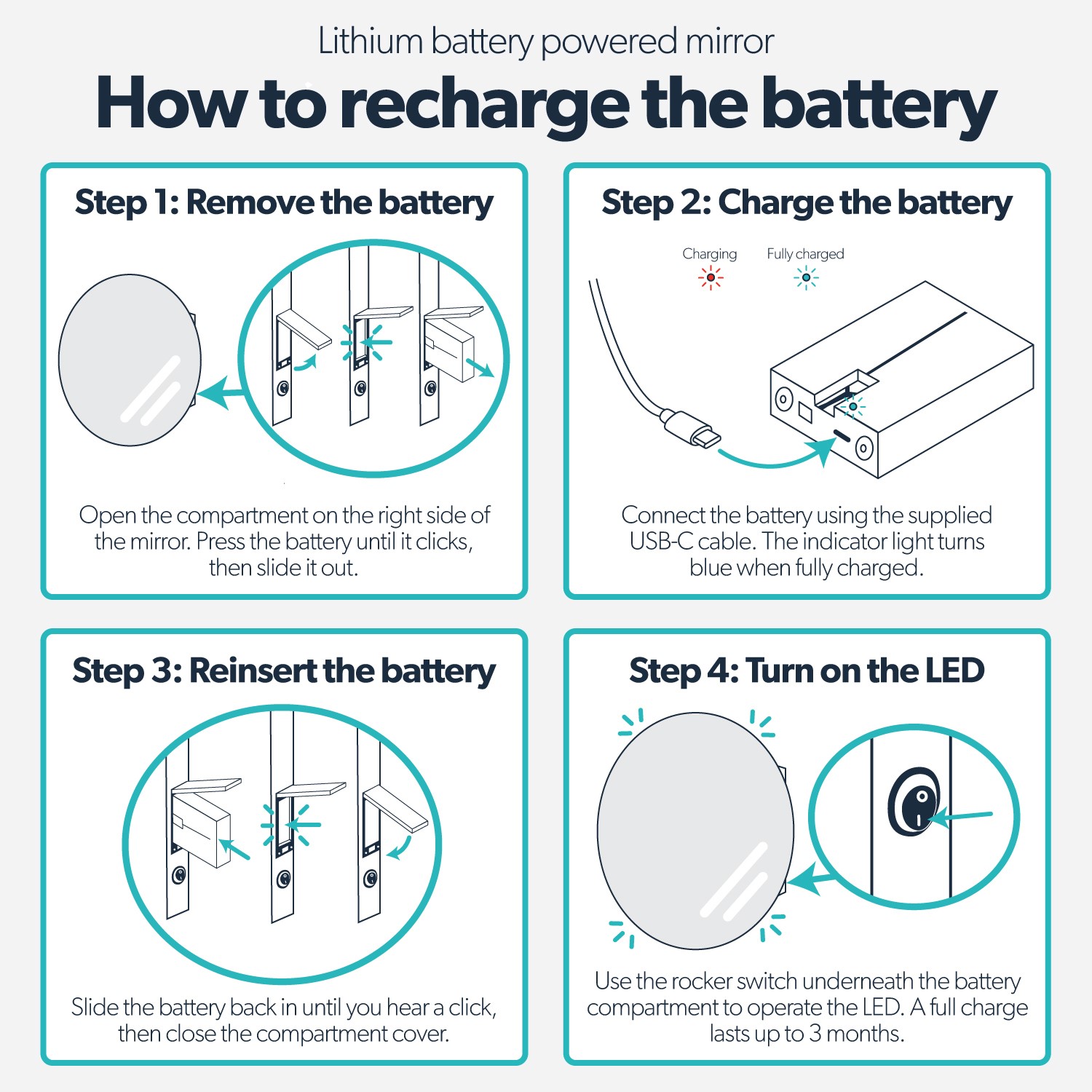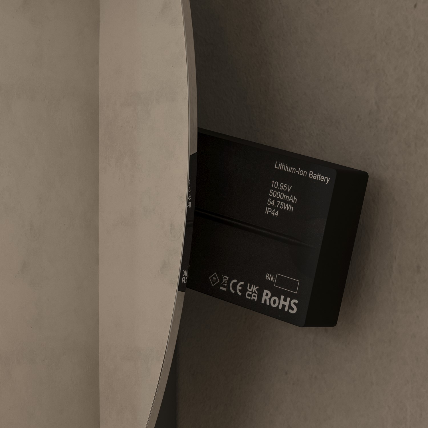 Lithium Battery Powered: A high-performance lithium battery powered wall mirror offering long-lasting, reliable power without the need for mains wiring, making it ideal for flexible placement throughout the home.