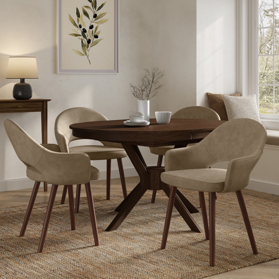 This Karie extending dining table is perfect for families or people who enjoy entertaining at a moment's notice. Its stylish round to oval design creates a practical solution to compact spaces and can be easily extended or closed with its butterfly mechanism. The warm walnut colour adds a rich, natural tone that brings depth and character to your dining space. A modern take on a timeless classic, this Karie table extends to seat up to six people and the pedestal legs provide additional leg space for added comfort.