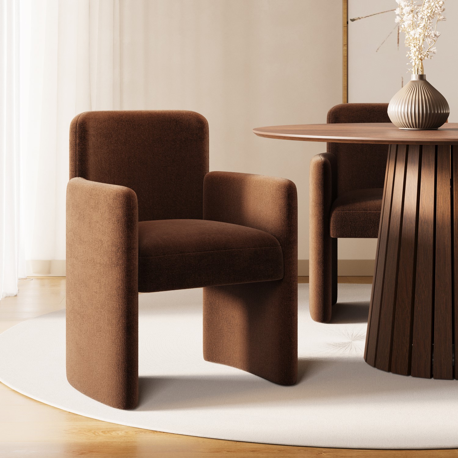 Understated elegance: Upholstered in a chenille rust fabric, this chair blends rich tones with minimalist styling. The fully upholstered frame and subtle curves give it a refined, sculptural look.