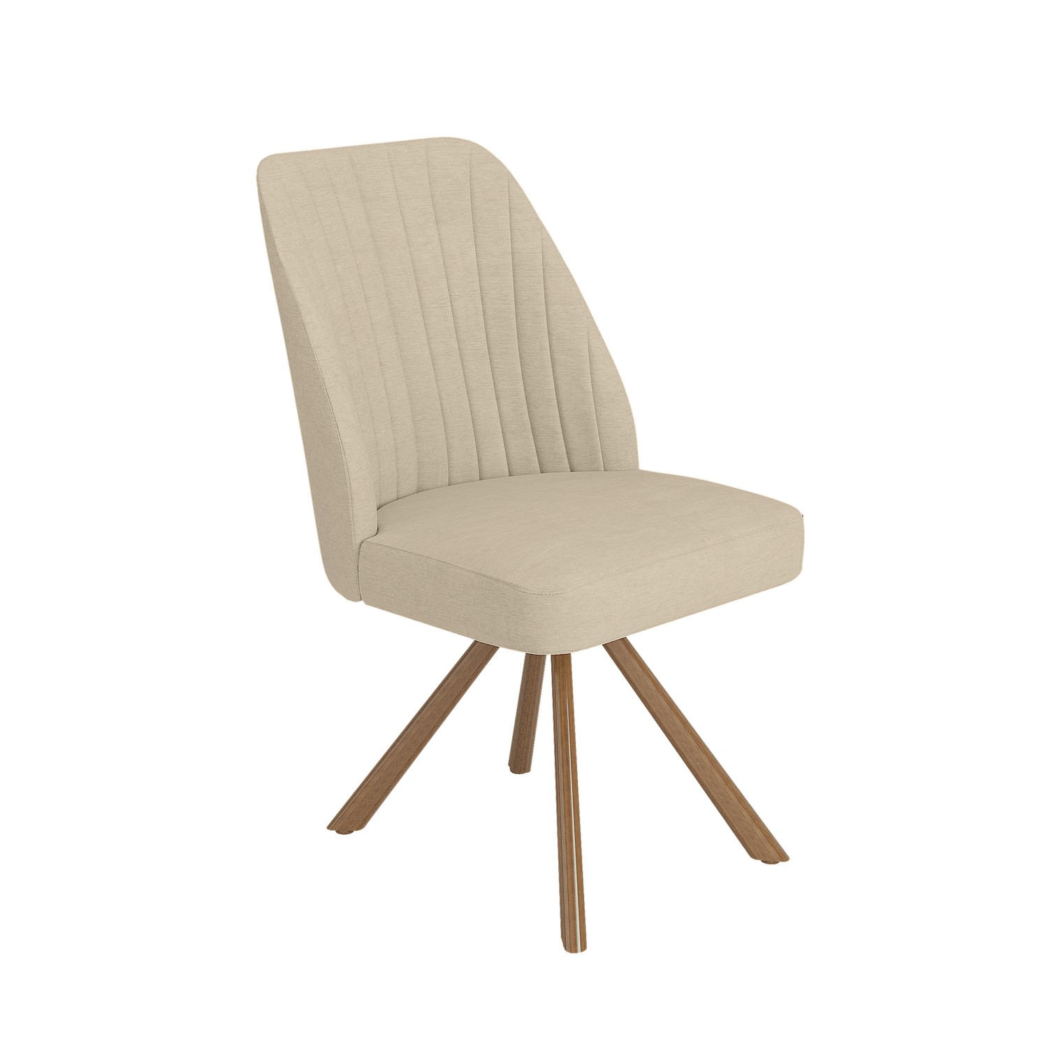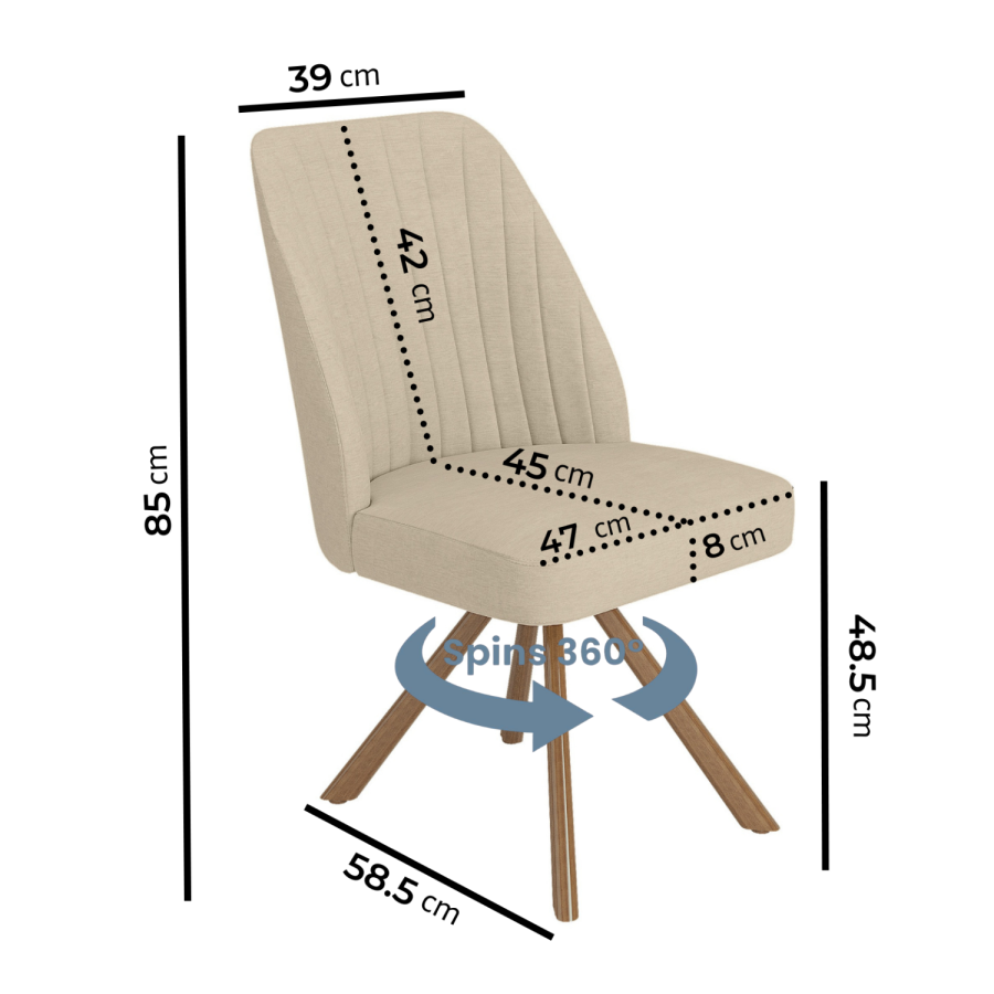 Style and practicality come together in the Logan dining chair set. Upholstered in soft beige fabric with vertical stitched lines, these chairs bring comfort and contemporary character to your space. The walnut-effect legs offer a deeper, natural finish that contrasts beautifully with the light upholstery. With a full 360° swivel and auto-return, they offer flexibility when in use and return neatly to their original position. Ideal for round or rectangular dining tables, Logan adds a warm, sophisticated touch to your dining area.