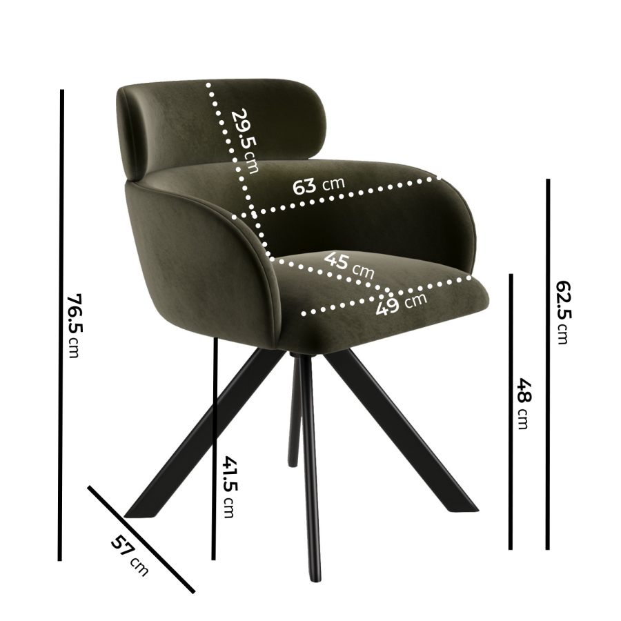 Add a stylish statement to your dining space with the Isla swivel chairs in green velvet. With their gently curved back, supportive arms and smooth velvet upholstery, these chairs are made for both looks and comfort. The 360° swivel base with auto-return brings added function and flair, ideal for busy mealtimes or entertaining. The soft green hue pairs beautifully with wood, marble or glass tables, while the matte black legs ground the look with a modern finish. A perfect blend of comfort, colour and design.