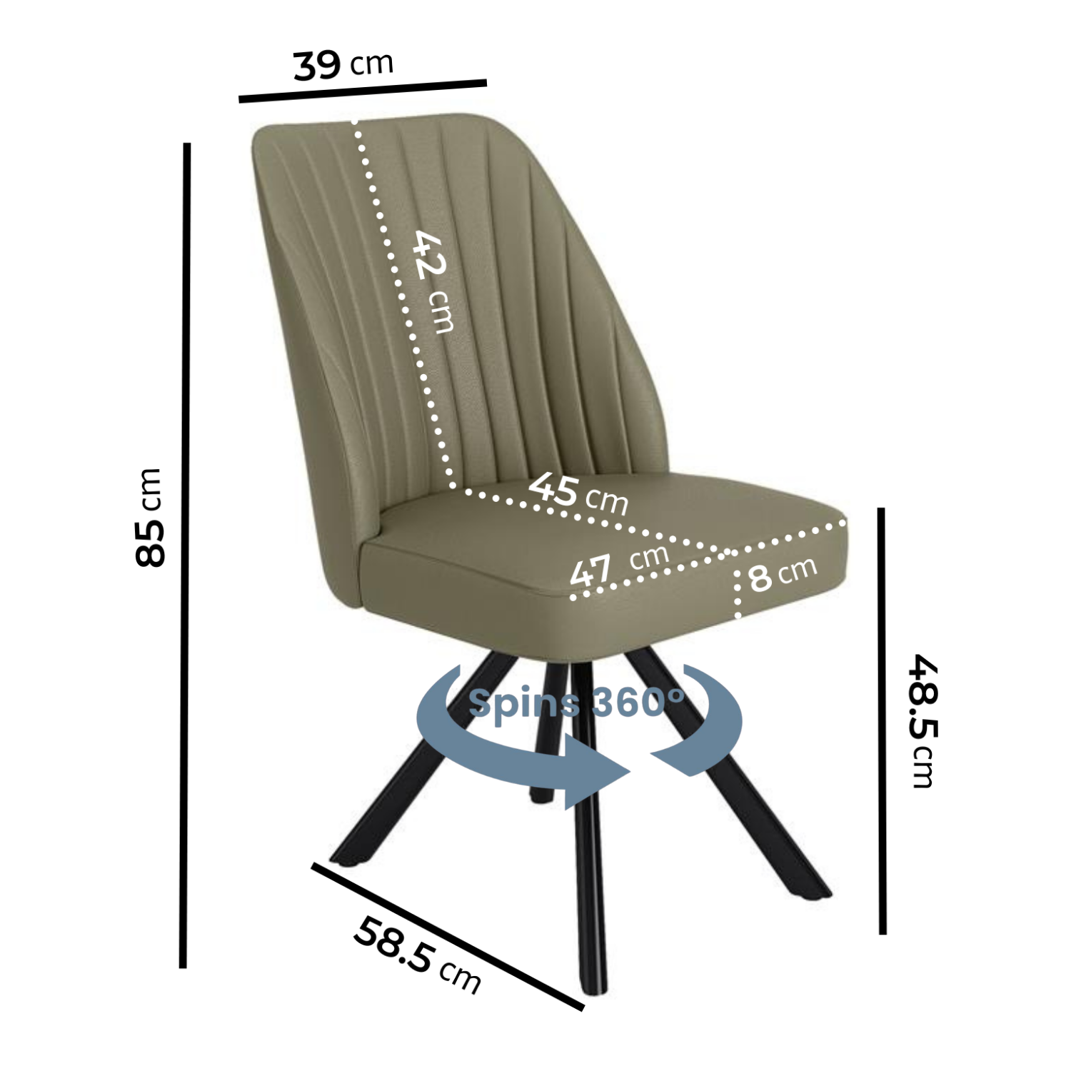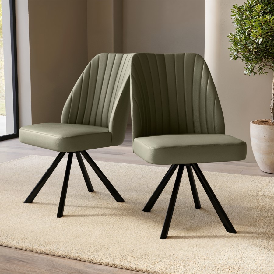 Refresh your dining space with the Logan swivel chairs – a stylish and practical addition to any modern kitchen or dining area. This set of two chairs is upholstered in sage green faux leather, offering an easy-clean surface with a soft, matte texture. The 360° swivel base allows easy movement, and thanks to the auto-return mechanism, the chairs reset neatly after use. Vertical stitched detailing brings a tailored look, while the black metal cross-base delivers a modern edge and reliable support. Whether used around a dining table or as accent chairs, Logan brings effortless charm and functionality to the room.