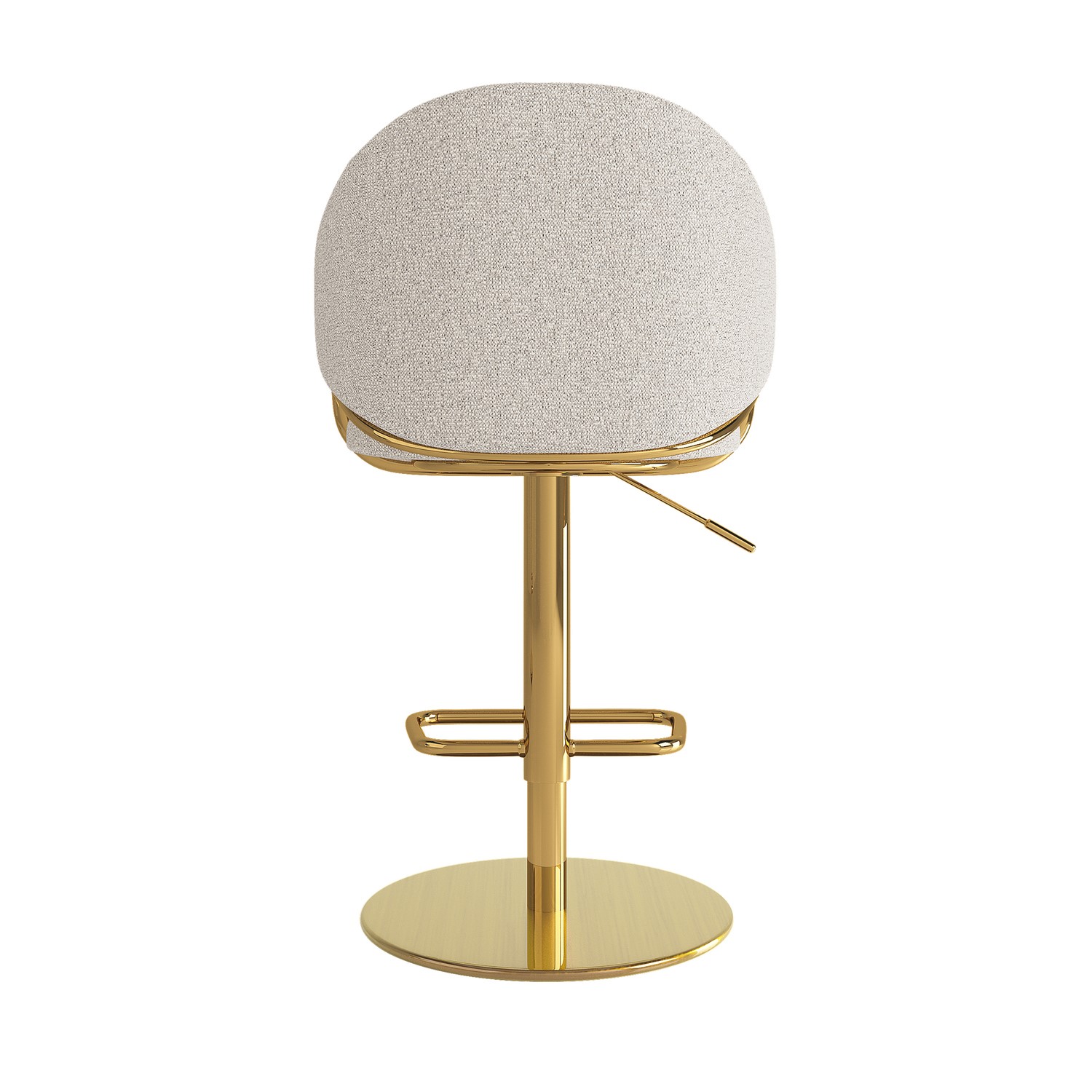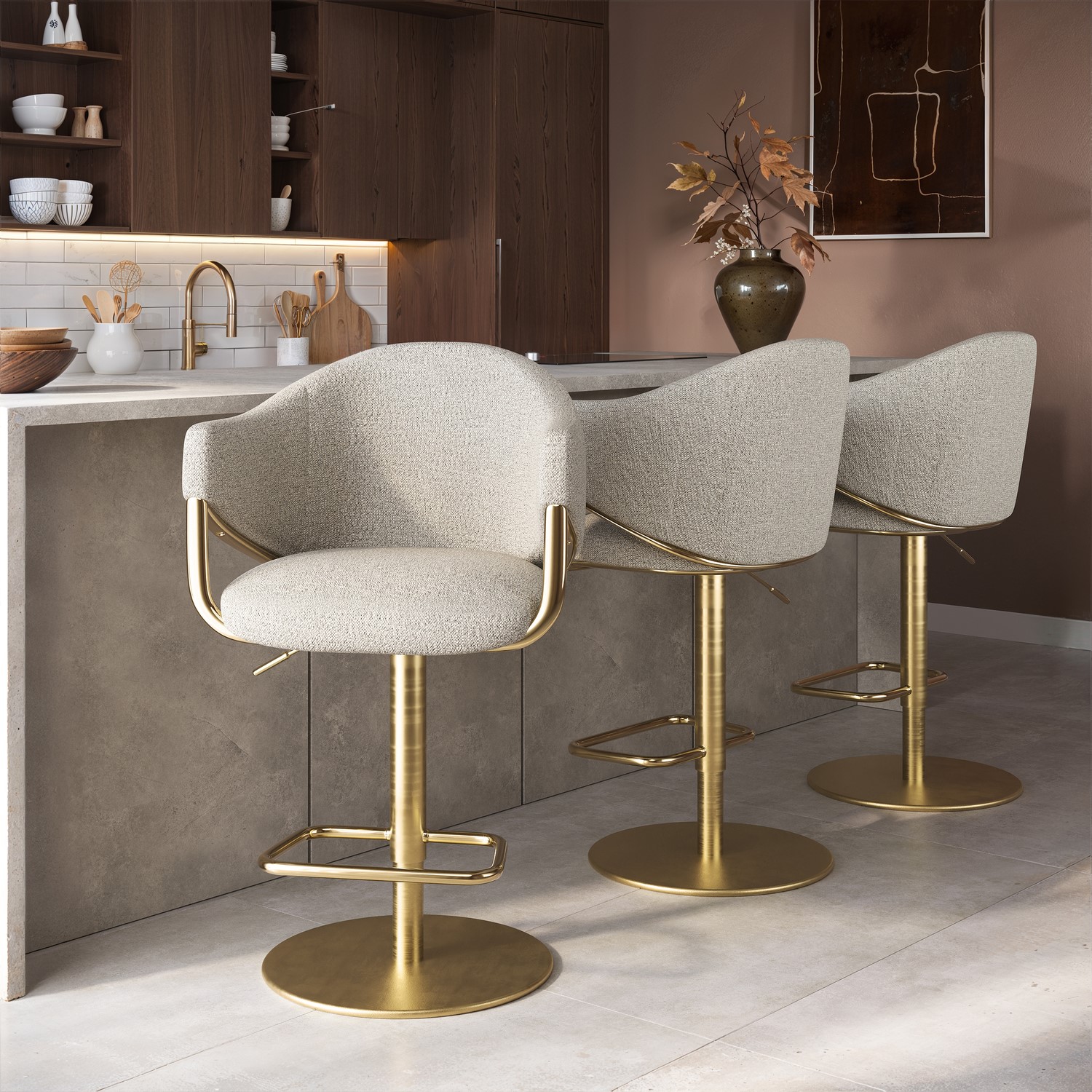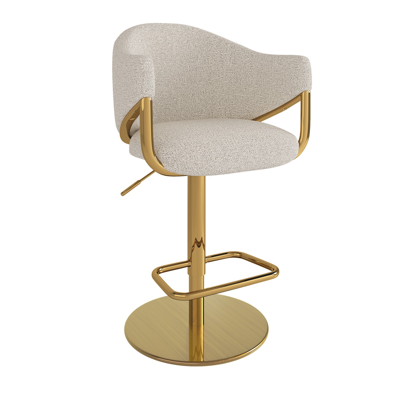 These Ronnie beige adjustable barstools perfectly blends luxury, functionality, and modern design. Upholstered in soft beige fabric, it instantly elevates the style of your kitchen or bar area. Its brushed gold base brings a contemporary flair, while the adjustable height and 360-degree swivel make it a practical choice for versatile use.