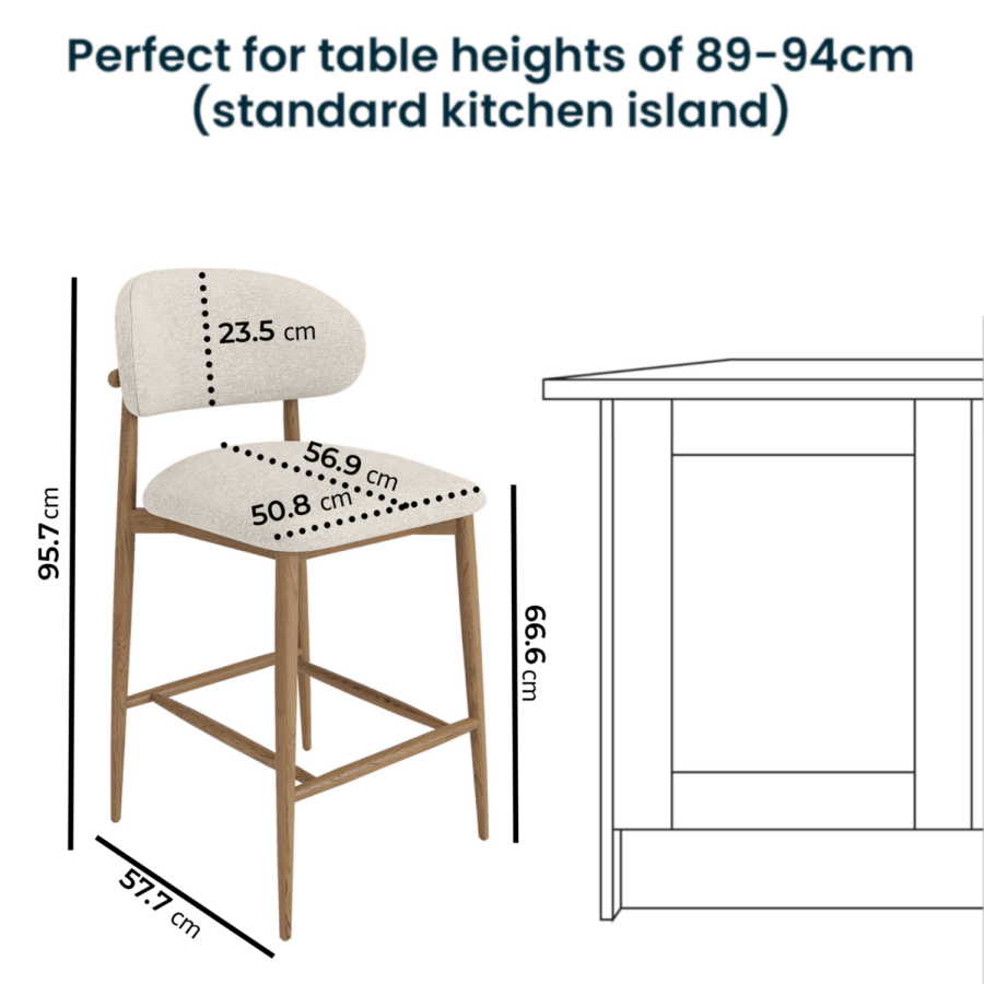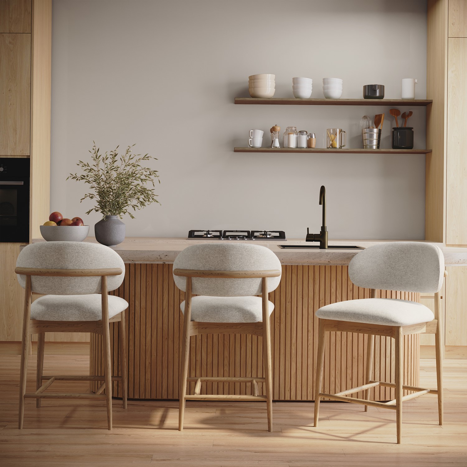 Elevate your kitchen with these beautiful mid-century modern flair designed counter stools, featuring a solid oak frame, an exposed backrest, and textured beige fabric upholstery for a sophisticated and welcoming appearance. The curved backrest and padded seat ensure maximum comfort, while the sturdy construction and supportive footrest add to their practicality. The exposed oak backrest highlights natural wood grain patterns, and the textured fabric adds a premium, tactile finish. With a strong natural wood frame, supportive footrest, and premium materials, they’re perfect for everyday use in busy kitchens or dining areas. Designed with the ideal height for standard kitchen counters, they combine practicality with aesthetic charm, making them a smart choice for all kitchens.