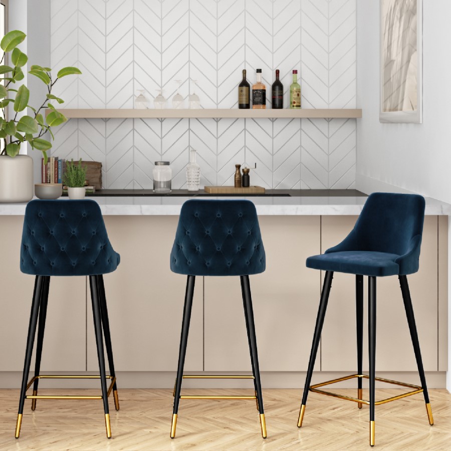 3 x Navy Velvet Bar Stools with Backs - Maddy