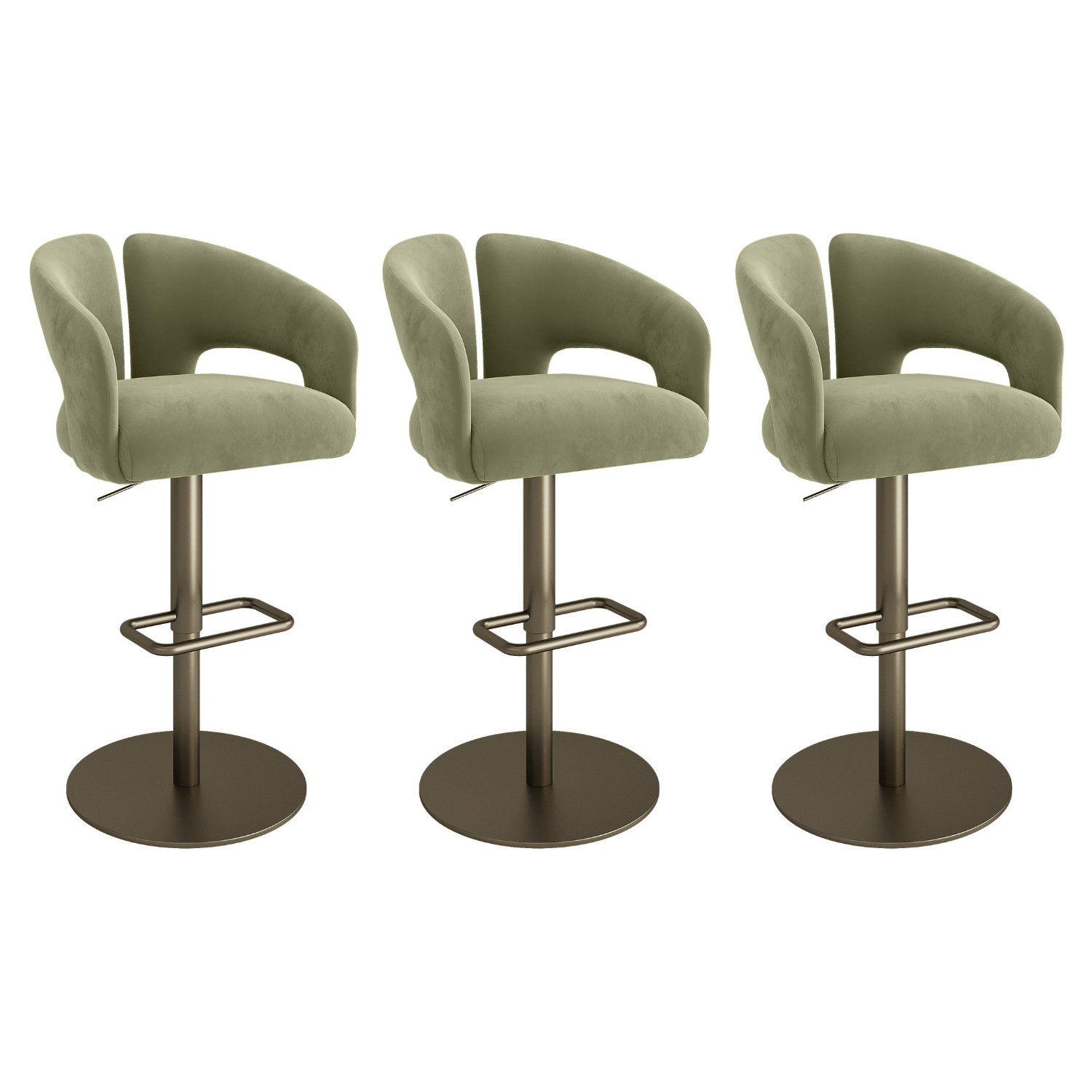 These Azalea bar stools in sage green brings a refined yet contemporary edge to your space. Upholstered in soft sage green velvet with a cut-out, curved back, it combines stylish form with everyday functionality. The antique brass base adds a warm accent that complements neutral or earthy palettes, while the gas-lift mechanism and swivel function let you adjust your seat with ease. Whether for casual meals or entertaining, Azalea offers the perfect blend of comfort and statement design – all in a compact footprint.