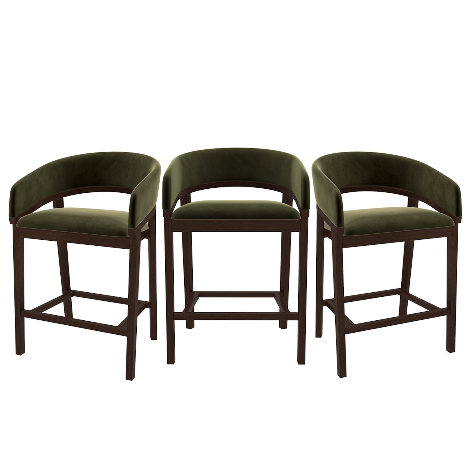 Upgrade your kitchen space with this contemporary curved kitchen stools. Designed with a cut-out backrest and gently curved armrests, it blends modern sophistication with everyday comfort. The soft olive green fabric and plush padding create an inviting seat, whether you're enjoying a quick breakfast or entertaining guests. Supported by a sturdy solid wood frame in a warm walnut-stained finish, these stools not only offers a refined aesthetic but also delivers exceptional durability for daily use.
